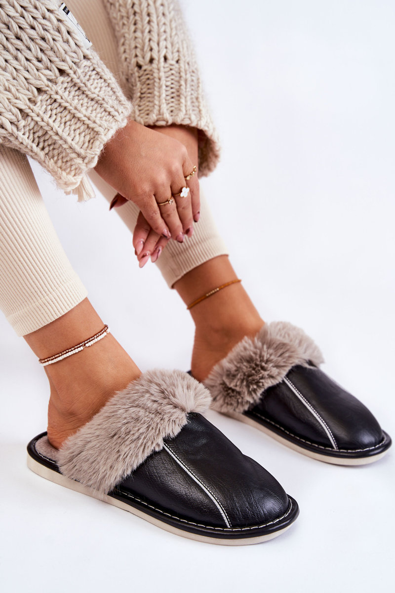 Women's Leather Slippers With Fur Black Rossa