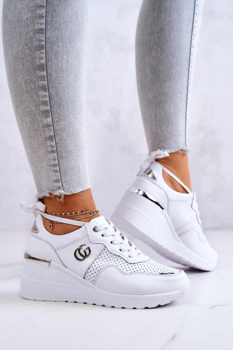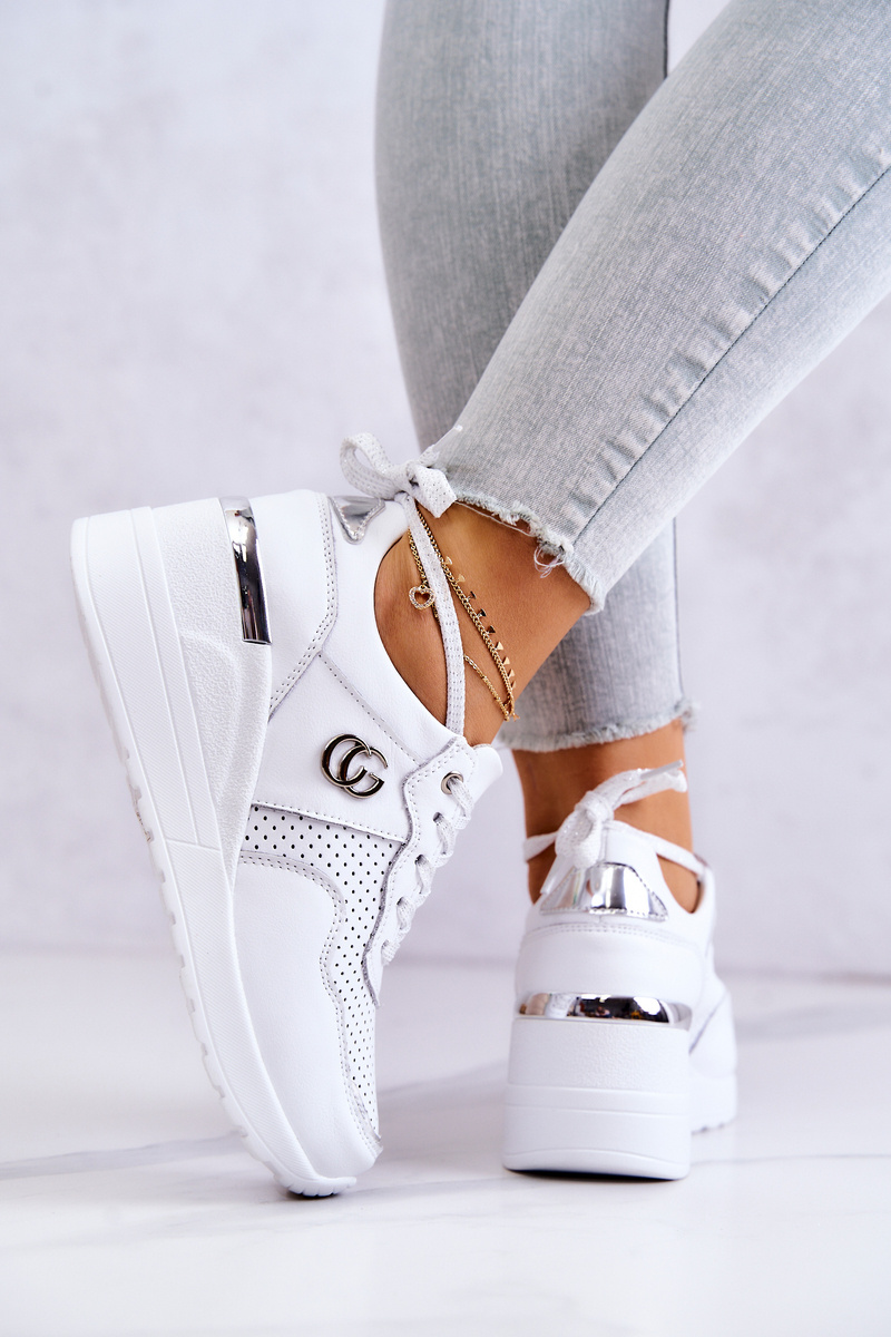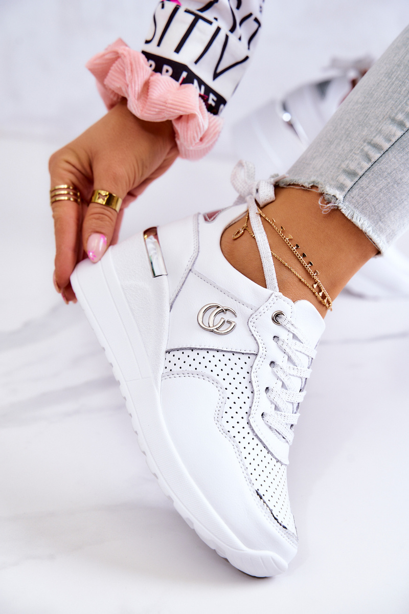 Unique women's sneakers made of natural leather with perforation on the front. They have a wedge that will gently lift your figure. Decorative, mirror inserts make these shoes look really wonderful! There is a decorative emblem on the side of the upper. Comfort insole made of natural leather with perforation is very soft to use. Classically tied model. You should have them in your wardrobe if you value comfort in use and a fashionable design at the same time! When choosing a size, please use the size chart.