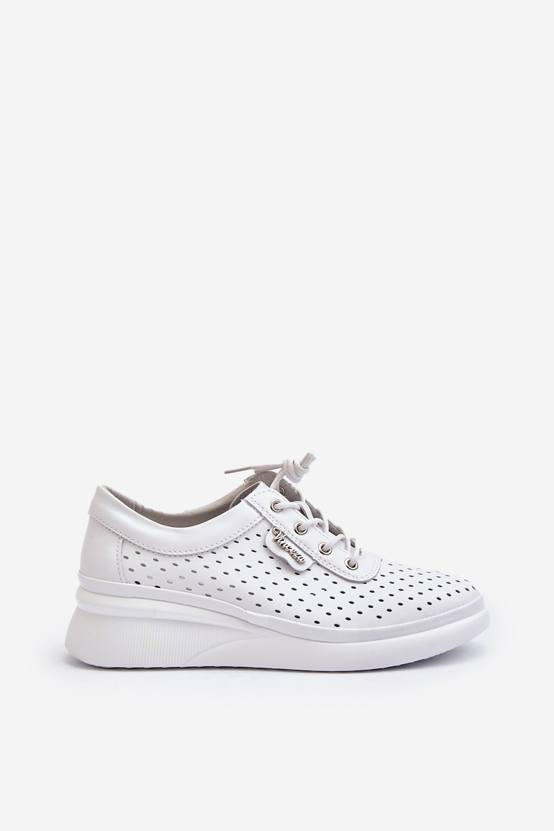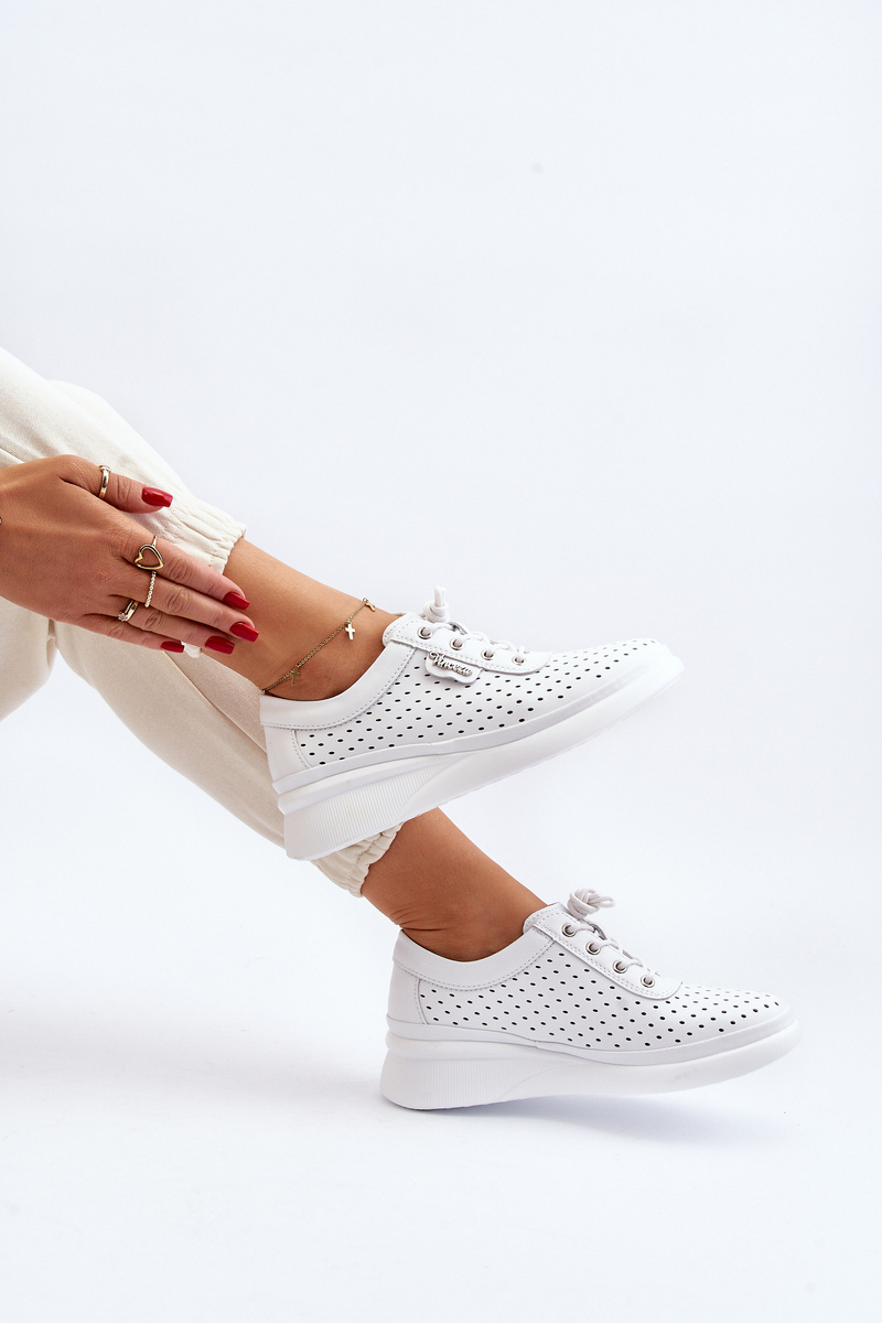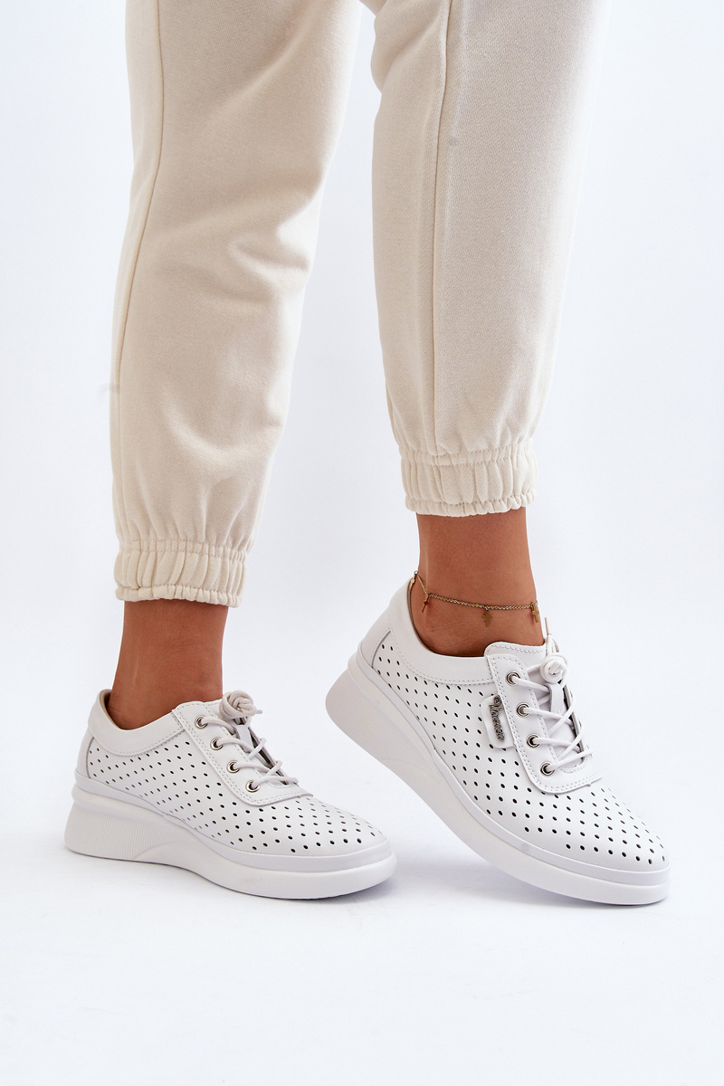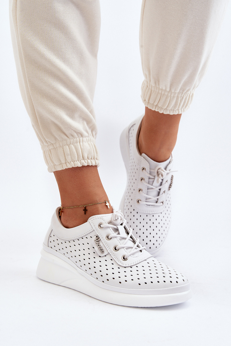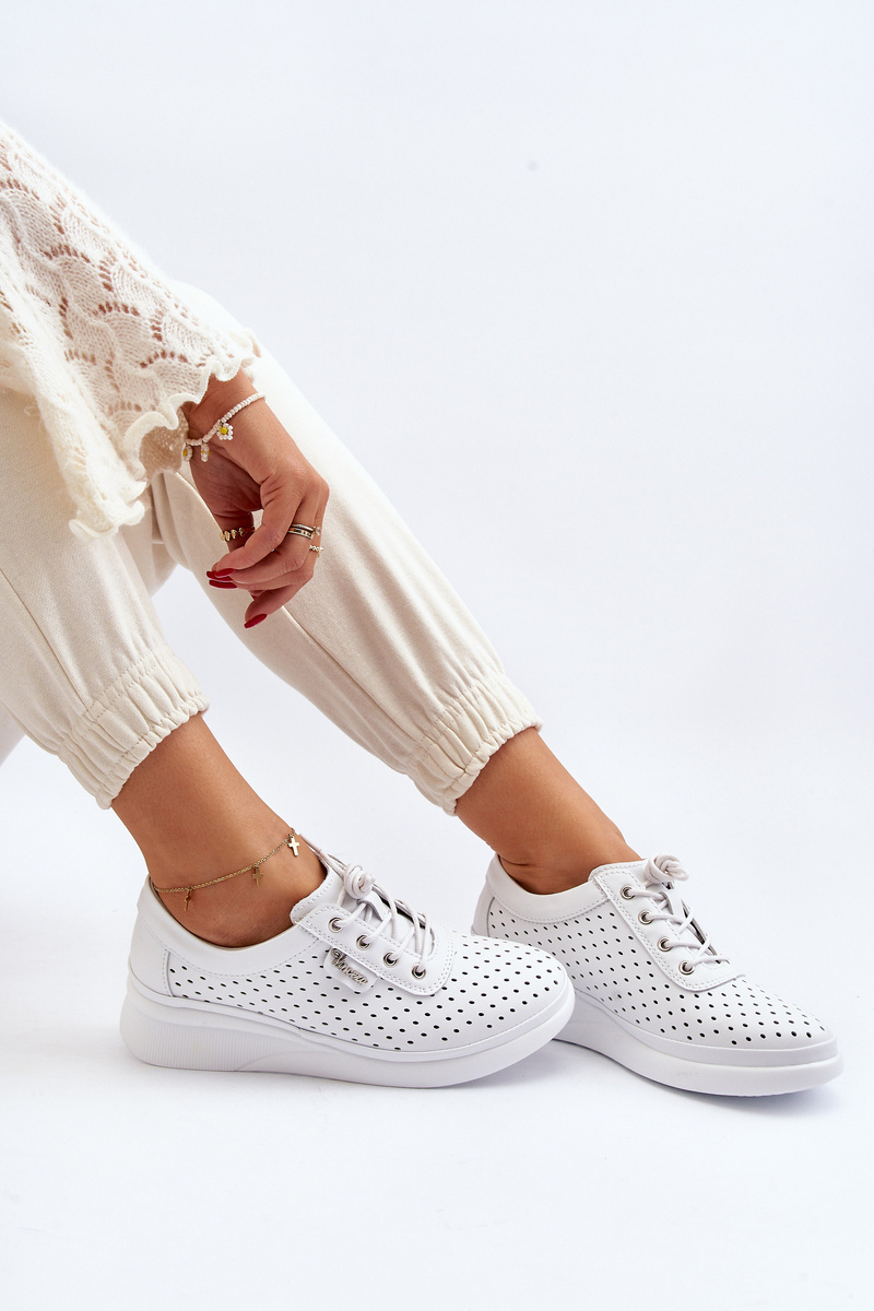 Beautiful women's sneakers are made of natural leather, which guarantees high quality and durability. Their perforated structure on the sides provides proper air flow, making them ideal for warm days. The model is classically laced, allowing for a perfect fit to the foot. The rounded toe adds elegance to the shoes. The soft, leather insole ensures comfort during wear. These fashionable sneakers are an excellent choice for everyday styling! When choosing a size, please refer to the size chart.