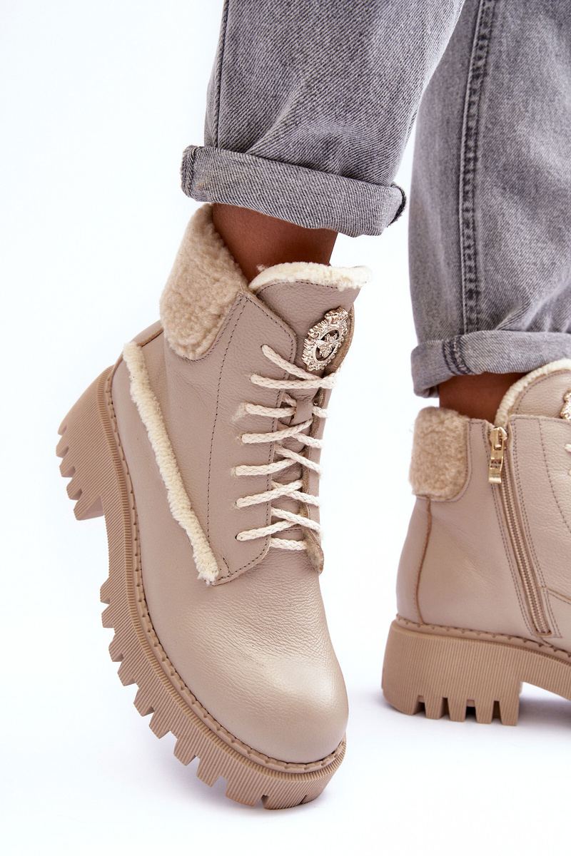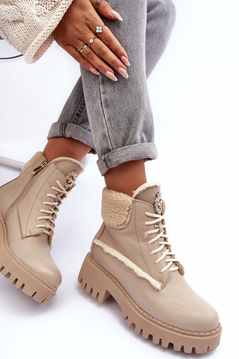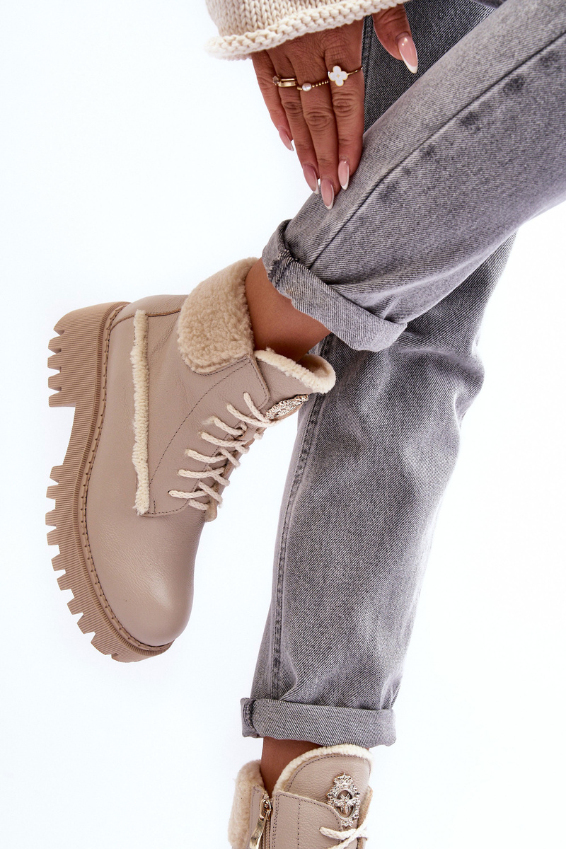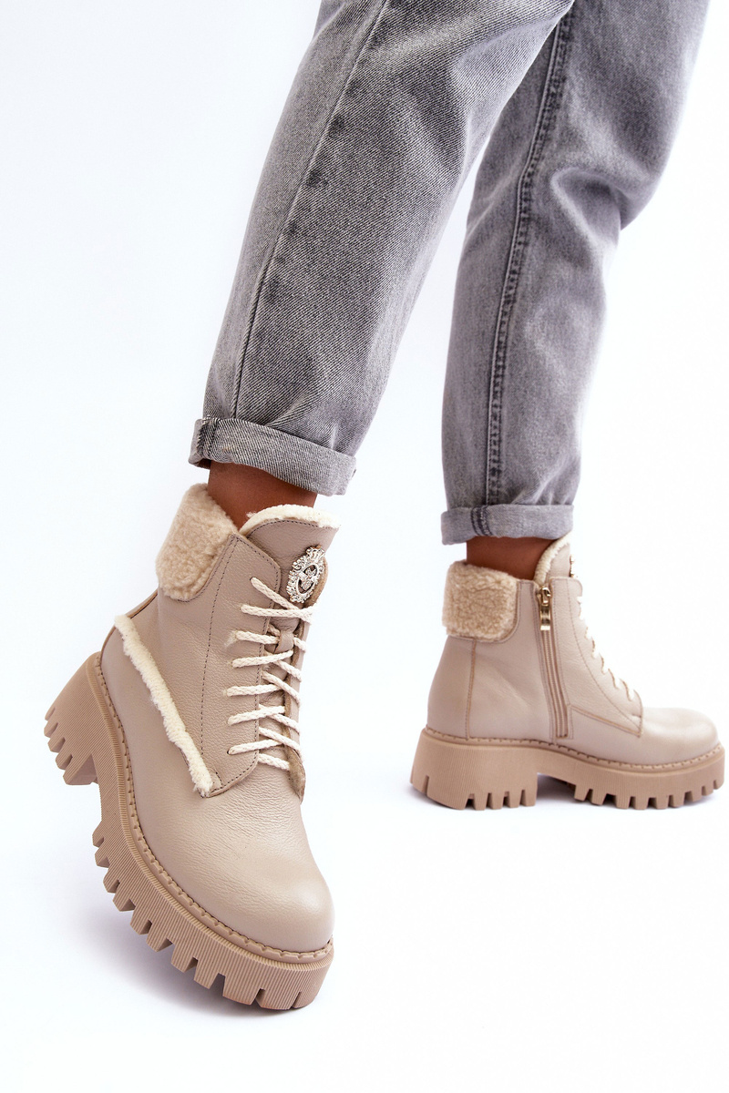 Boots in the form of trappers were mounted on a massive heel. Tread sole. There is a decorative element on the tongue. The hiking boots are made of high-quality natural leather. Inside, the boots are insulated with wool. This model has lacing and a zipper on the side of the upper. Additionally, the heel counter is stiffened. When choosing a size, please use the size chart.