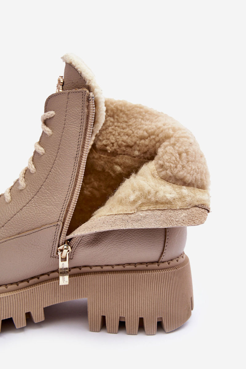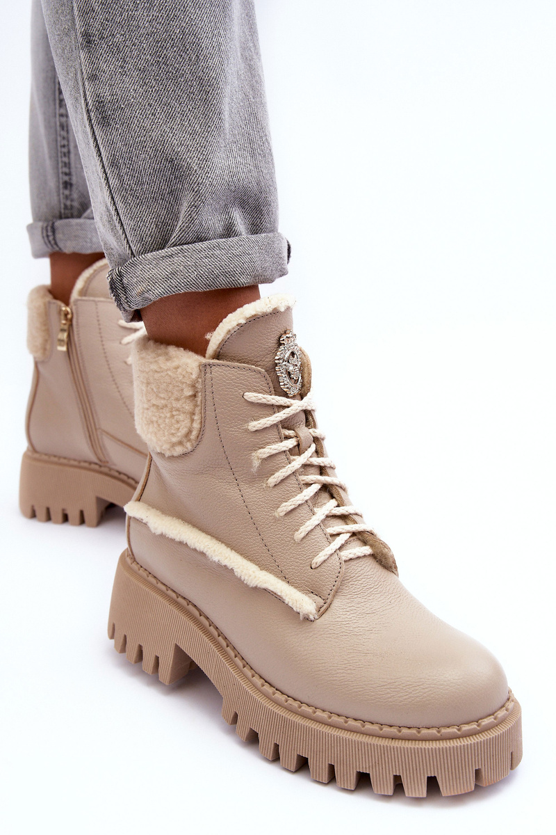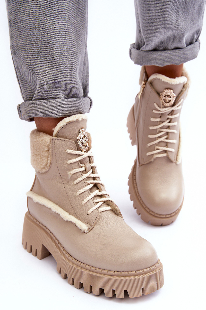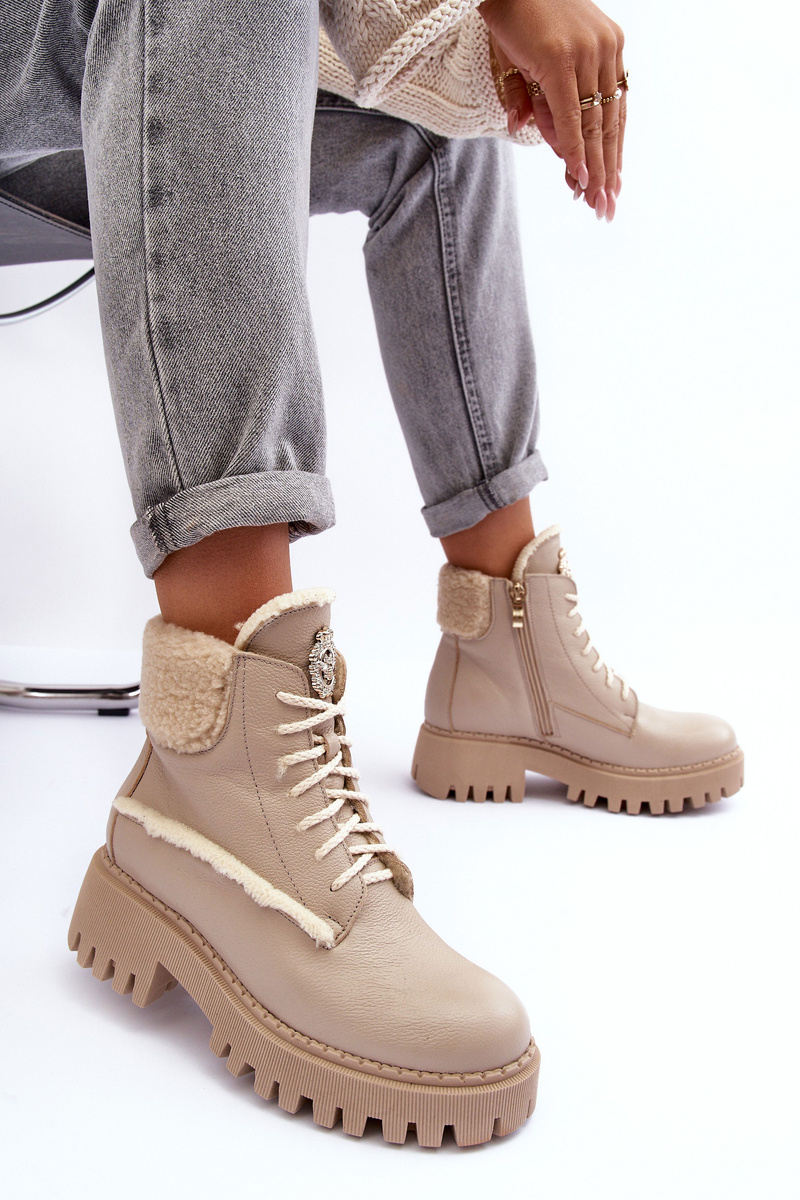 Boots in the form of trappers were mounted on a massive heel. Tread sole. There is a decorative element on the tongue. The hiking boots are made of high-quality natural leather. Inside, the boots are insulated with wool. This model has lacing and a zipper on the side of the upper. Additionally, the heel counter is stiffened. When choosing a size, please use the size chart.