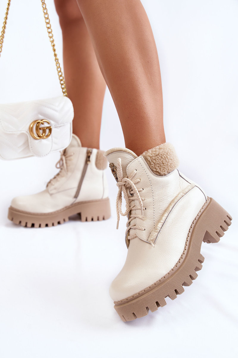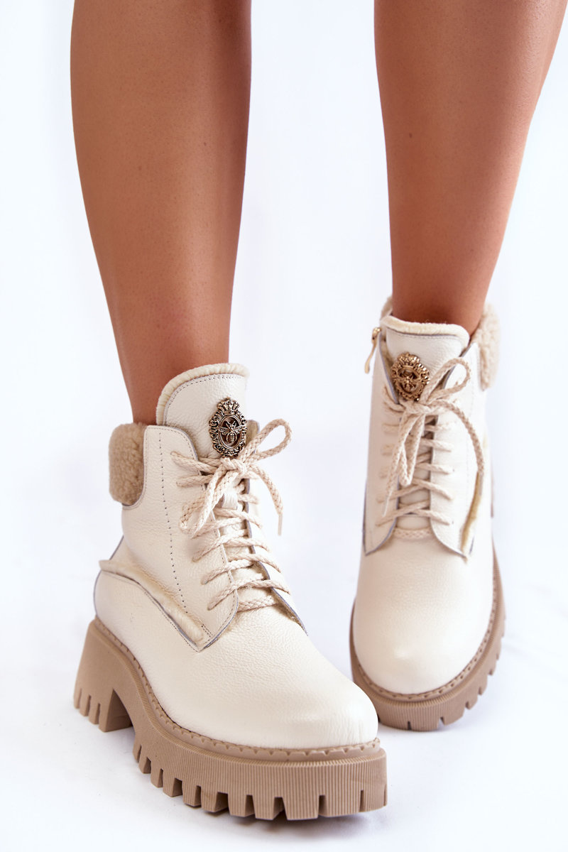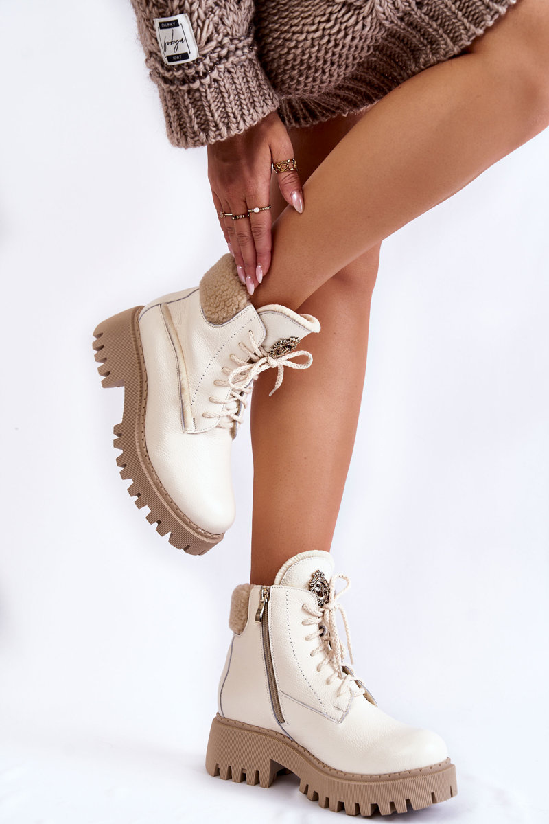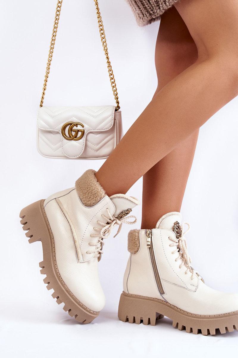 Boots in the form of trappers were mounted on a massive heel. Tread sole. There is a decorative element on the tongue. The hiking boots are made of high-quality natural leather. Inside, the boots are insulated with wool. This model has lacing and a zipper on the side of the upper. Additionally, the heel counter is stiffened. When choosing a size, please use the size chart.