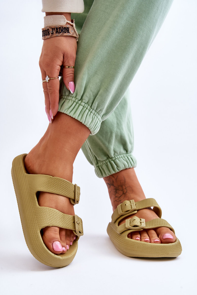 Extremely light women's slippers set on the platform are made of foam material. They have adjustable straps fastened with buckles. This model is classic slip-on. Slippers are also great as footwear for the pool. Be sure to also check out the other models of women's flip-flops! When choosing a size, please refer to the size chart.