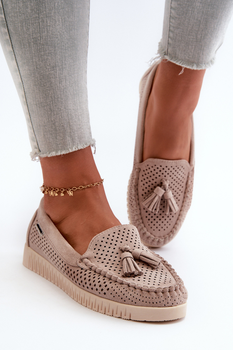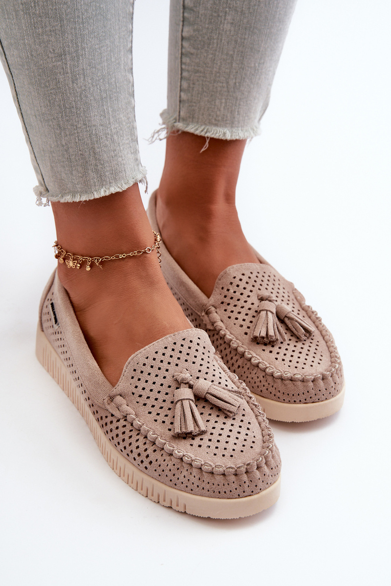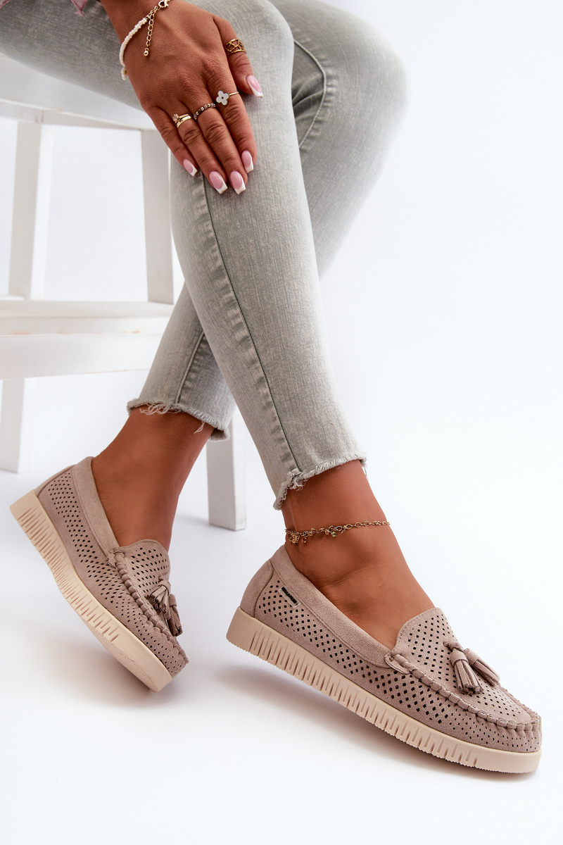 Women's moccasins made of eco suede. Set on a platform. Rounded toes. The front is decorated with small fringes. This model has a soft leather insole that will provide comfort during wear. A classic design that you can match with casual and elegant stylings. When choosing a size, please refer to the size chart.