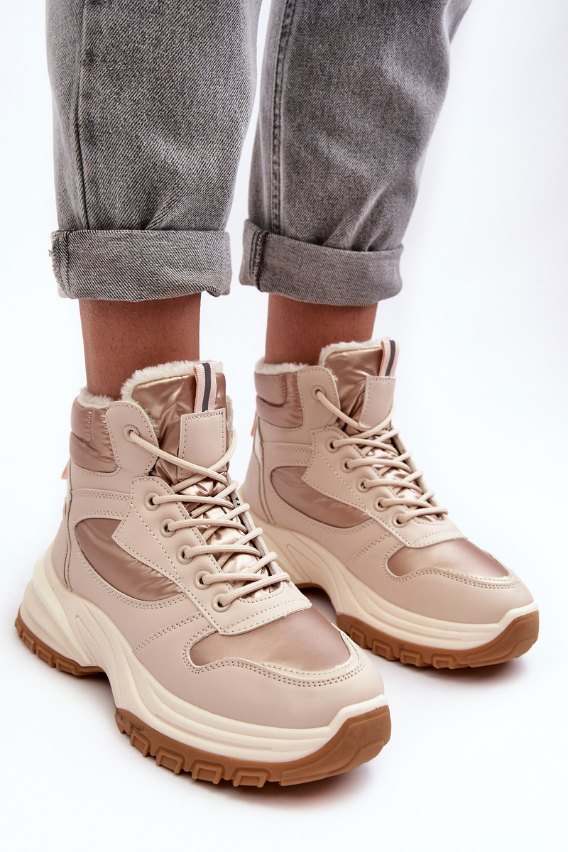 Women's insulated fur-lined sports shoes. Made from a combination of eco-leather and textile material. This fashionable style of insulated sports shoes is set on a flat heel and massive platform with grooves. The higher ankle will make you feel incredibly warm in them. When choosing a size, please refer to the size chart.