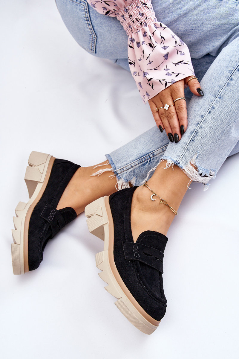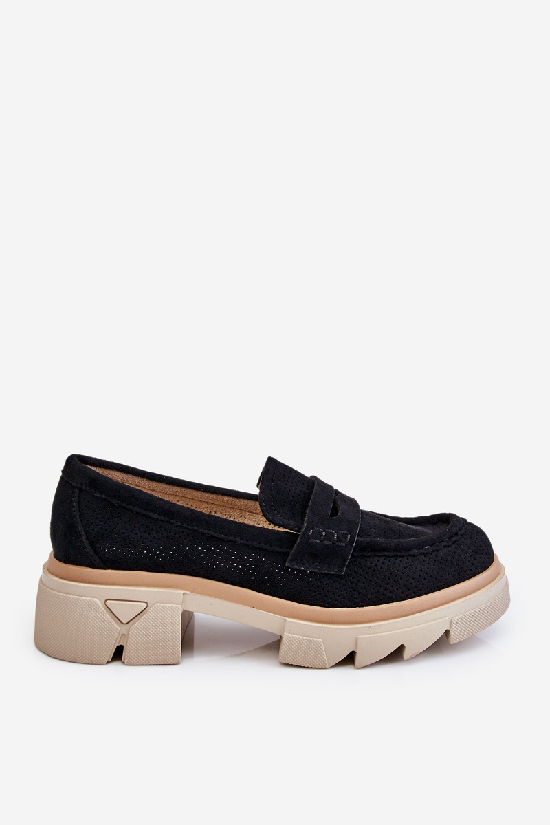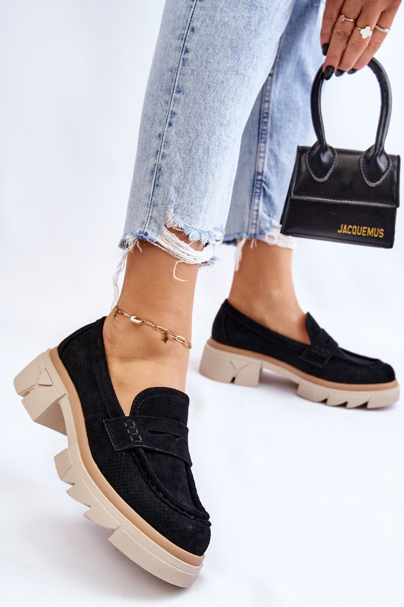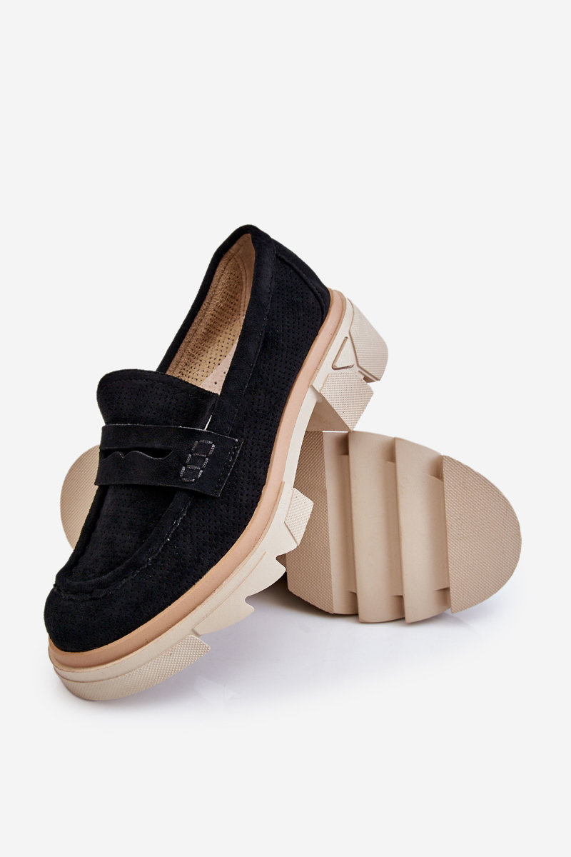 Women's moccasin-style loafers set on a massive, flat heel and platform. Made of a material resembling eco suede. The soft insole made of natural leather will ensure comfort during use. Upper in an openwork pattern. The clasp has been stiffened. A great model for many styles! When choosing a size, please refer to the size chart.