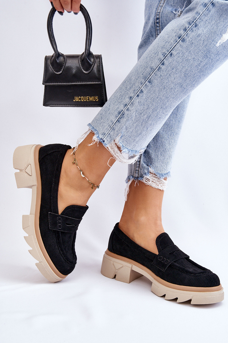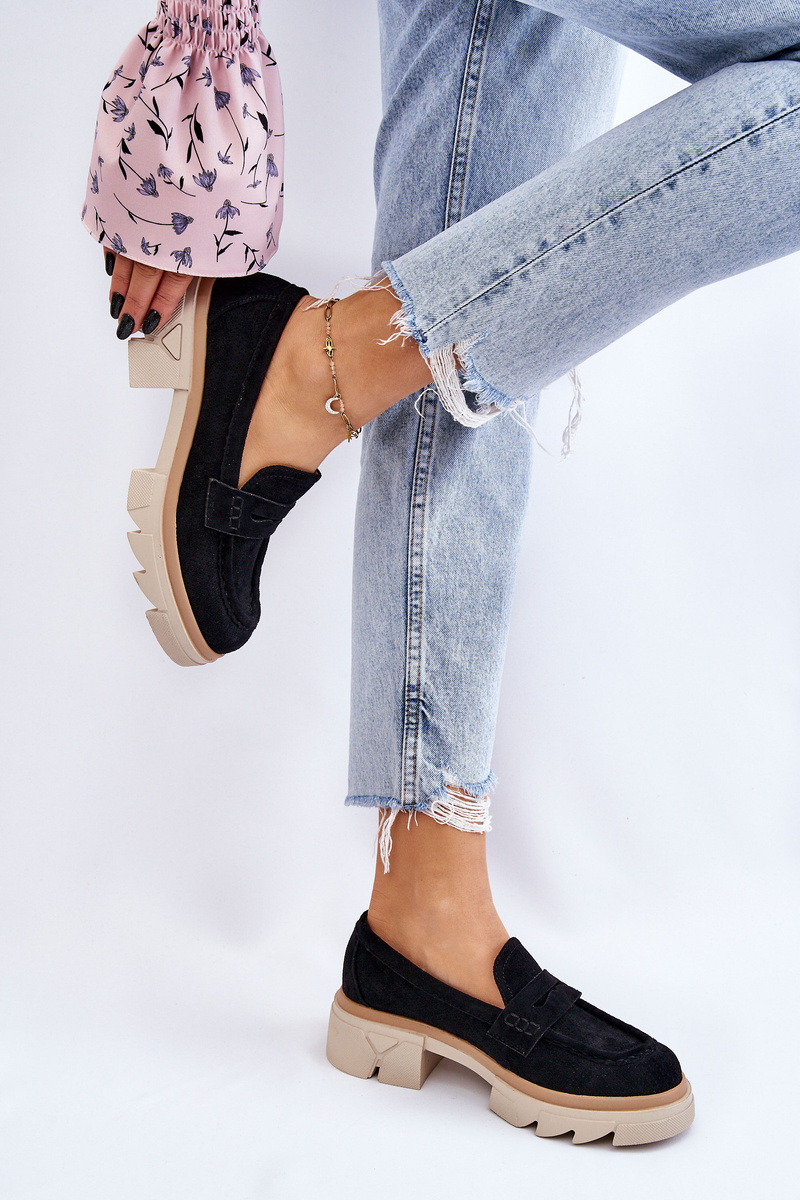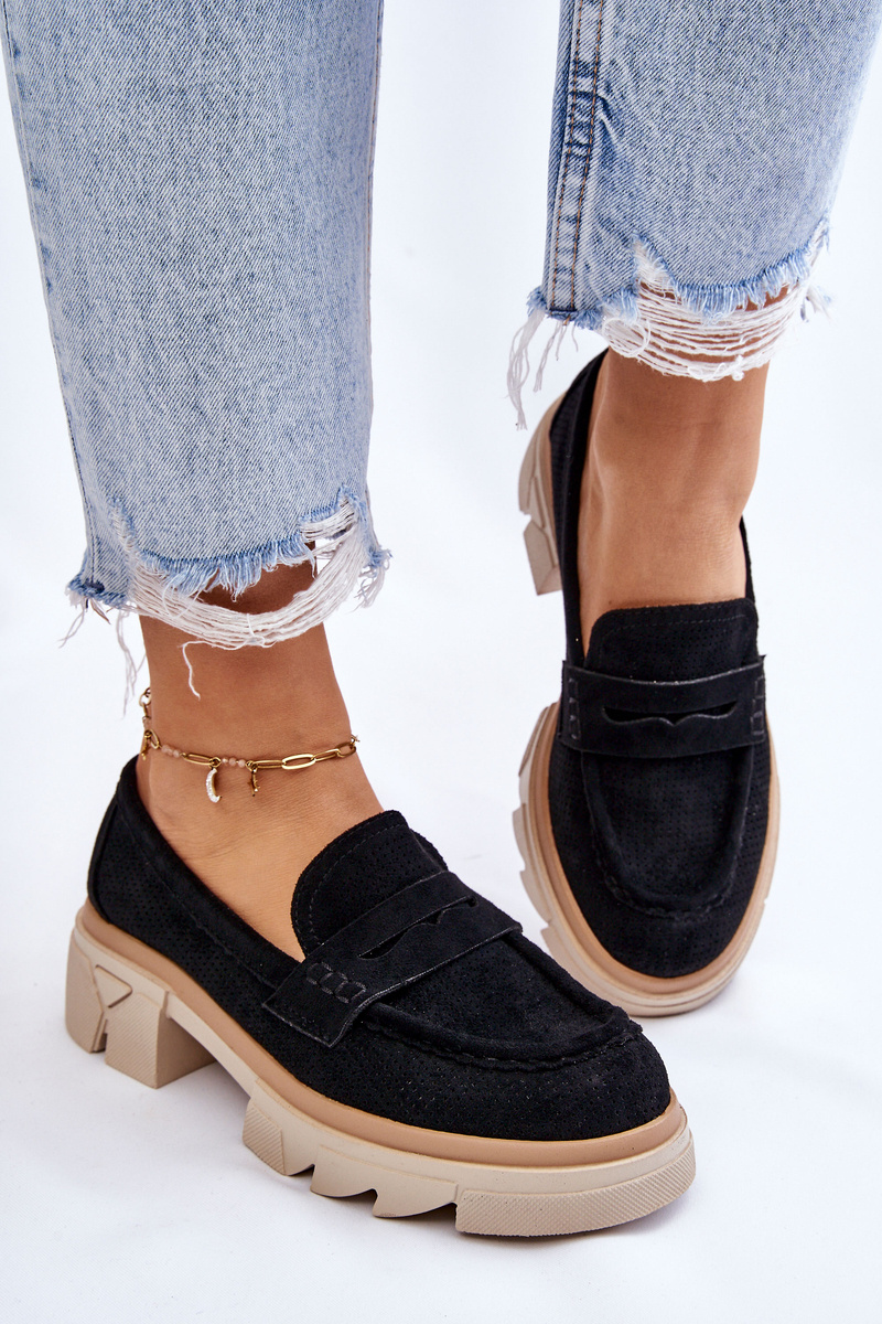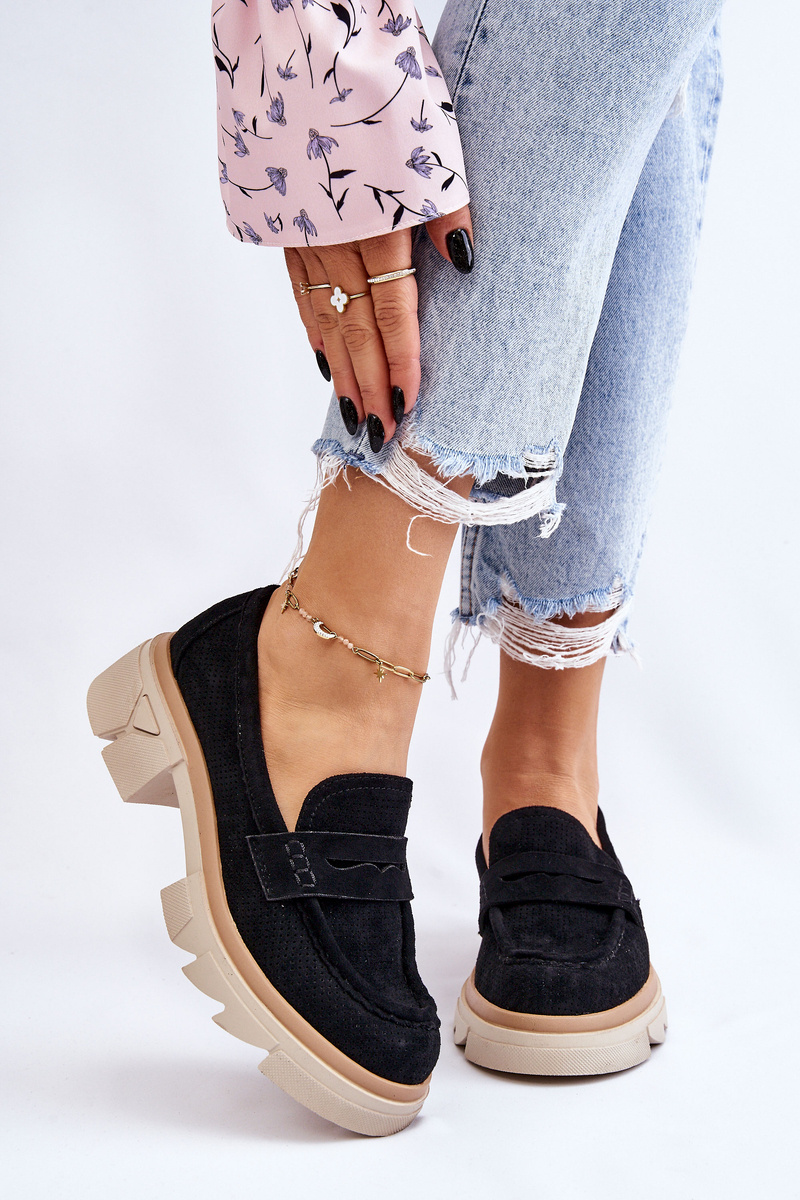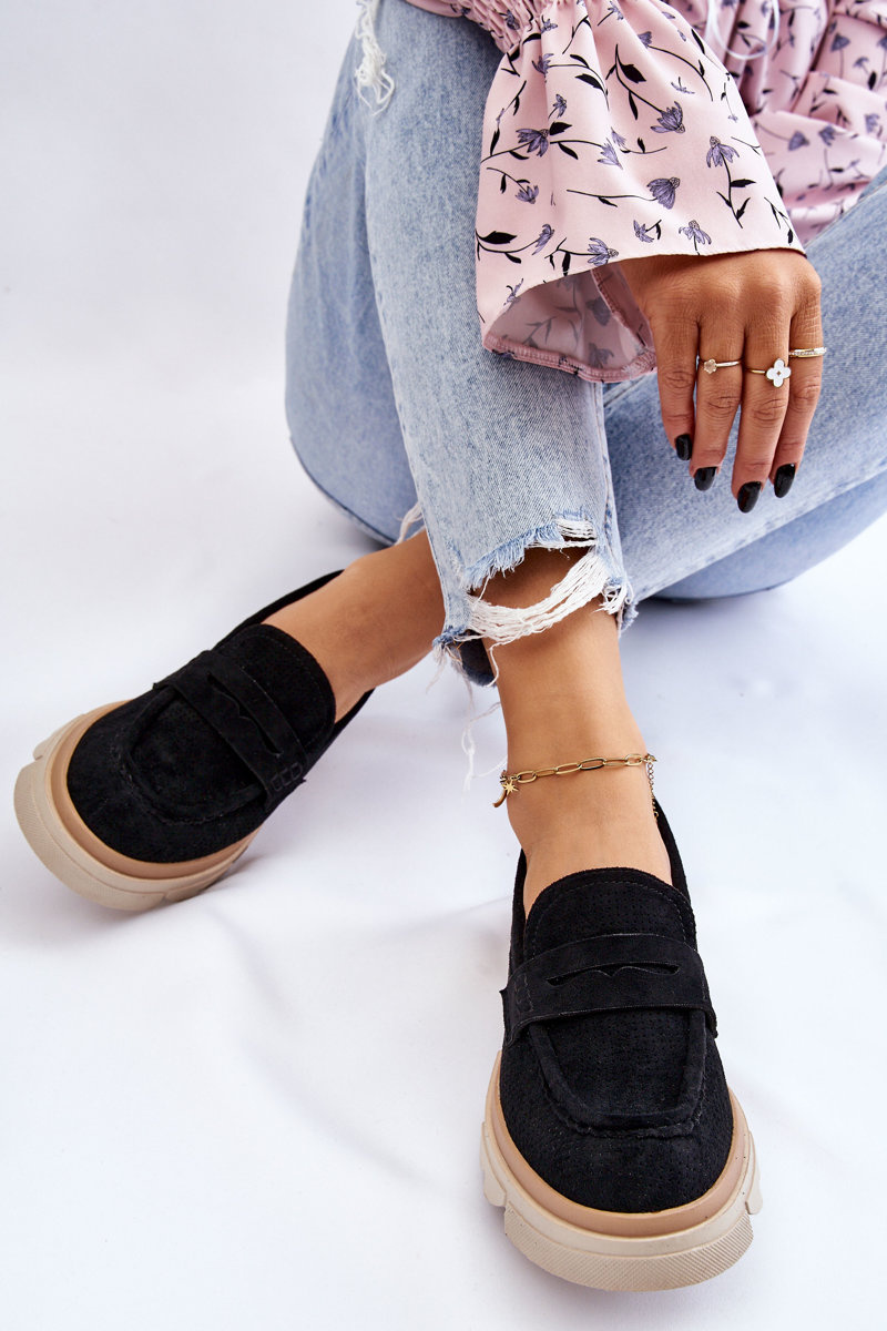 Women's moccasin-style loafers set on a massive, flat heel and platform. Made of a material resembling eco suede. The soft insole made of natural leather will ensure comfort during use. Upper in an openwork pattern. The clasp has been stiffened. A great model for many styles! When choosing a size, please refer to the size chart.