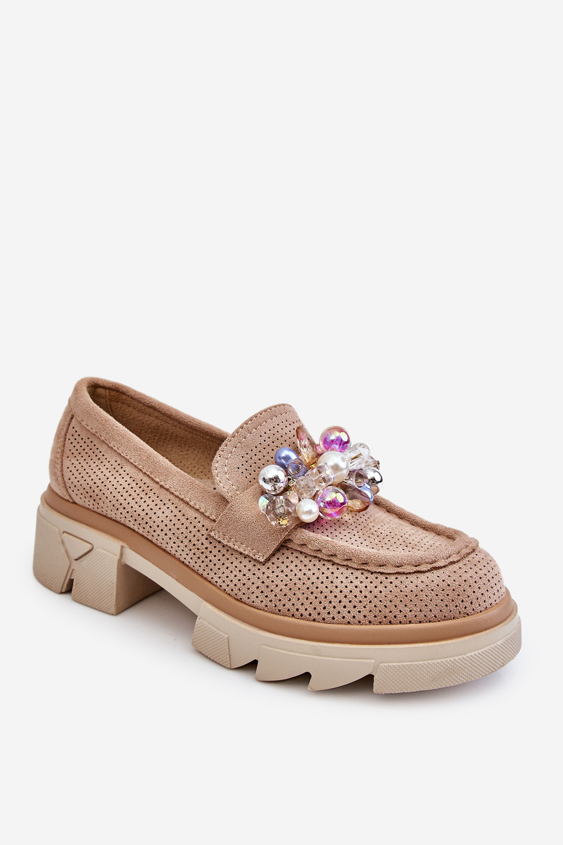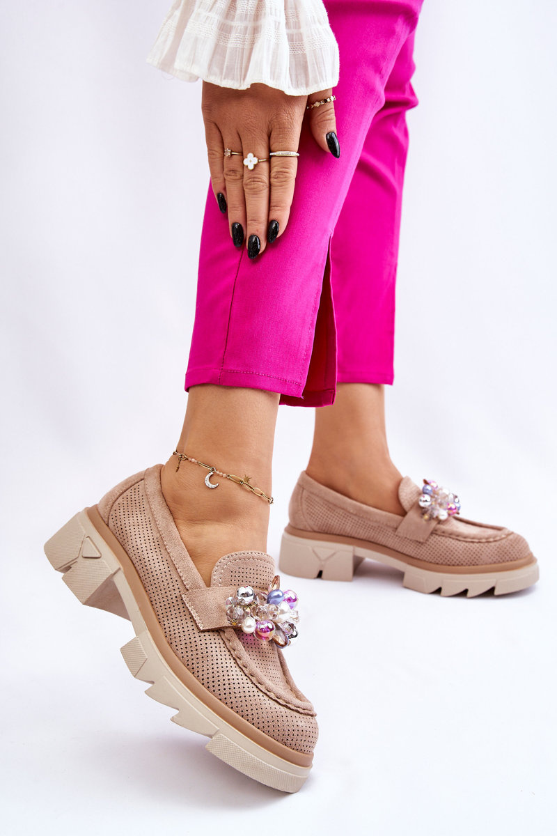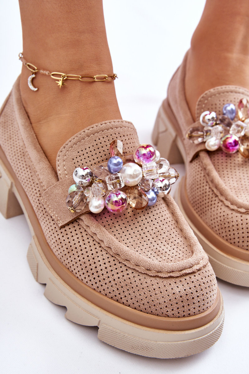 Fashionable, women's loafer-style shoes have been set on a massive, flat heel and platform. Decorated with beads on the front. Made of a material resembling eco suede. The soft insole made of natural leather will ensure comfort during use. Upper in an openwork pattern. A great model for many styles. Perfect for the spring-autumn season! When choosing a size, please refer to the size chart.