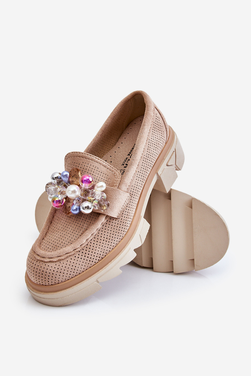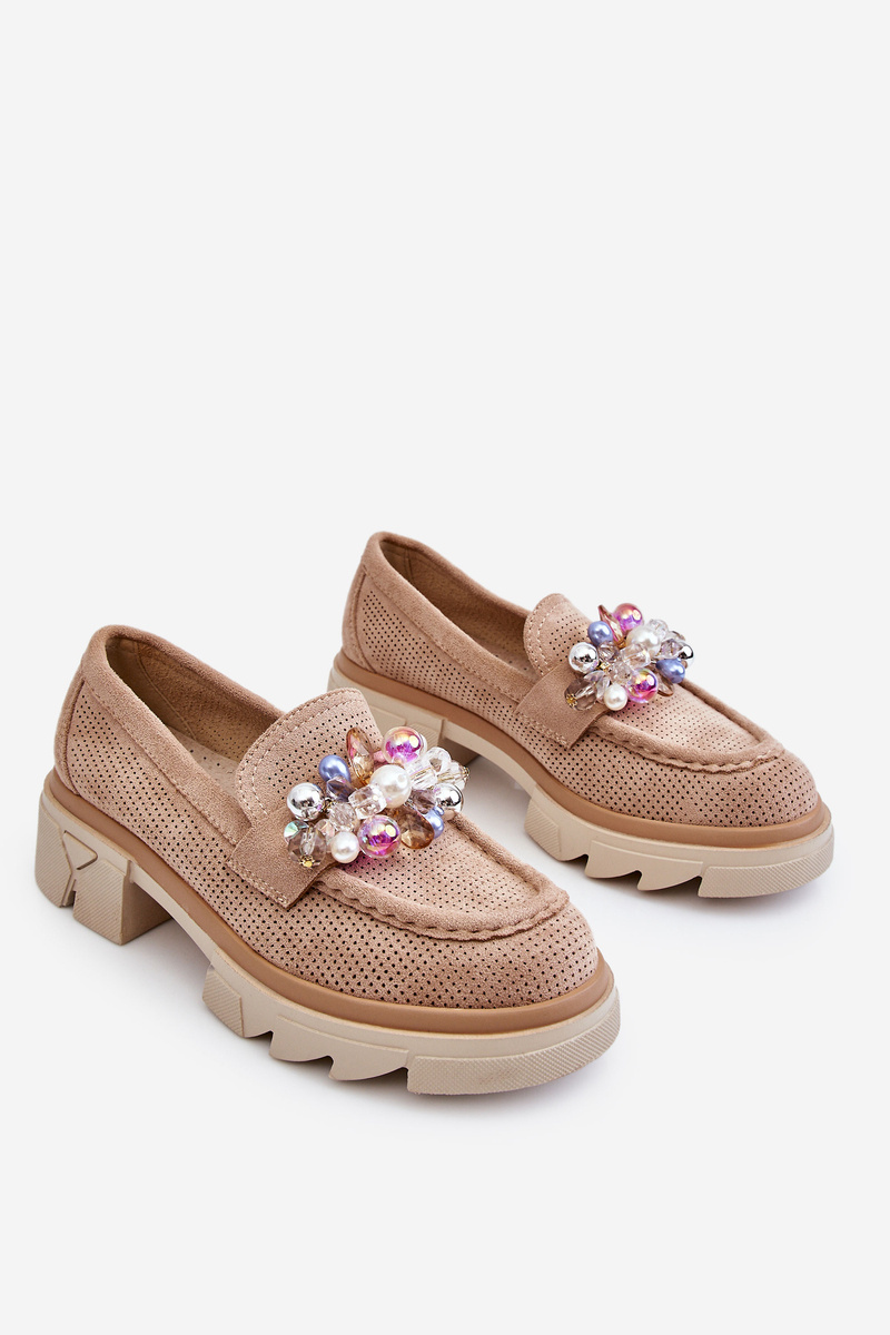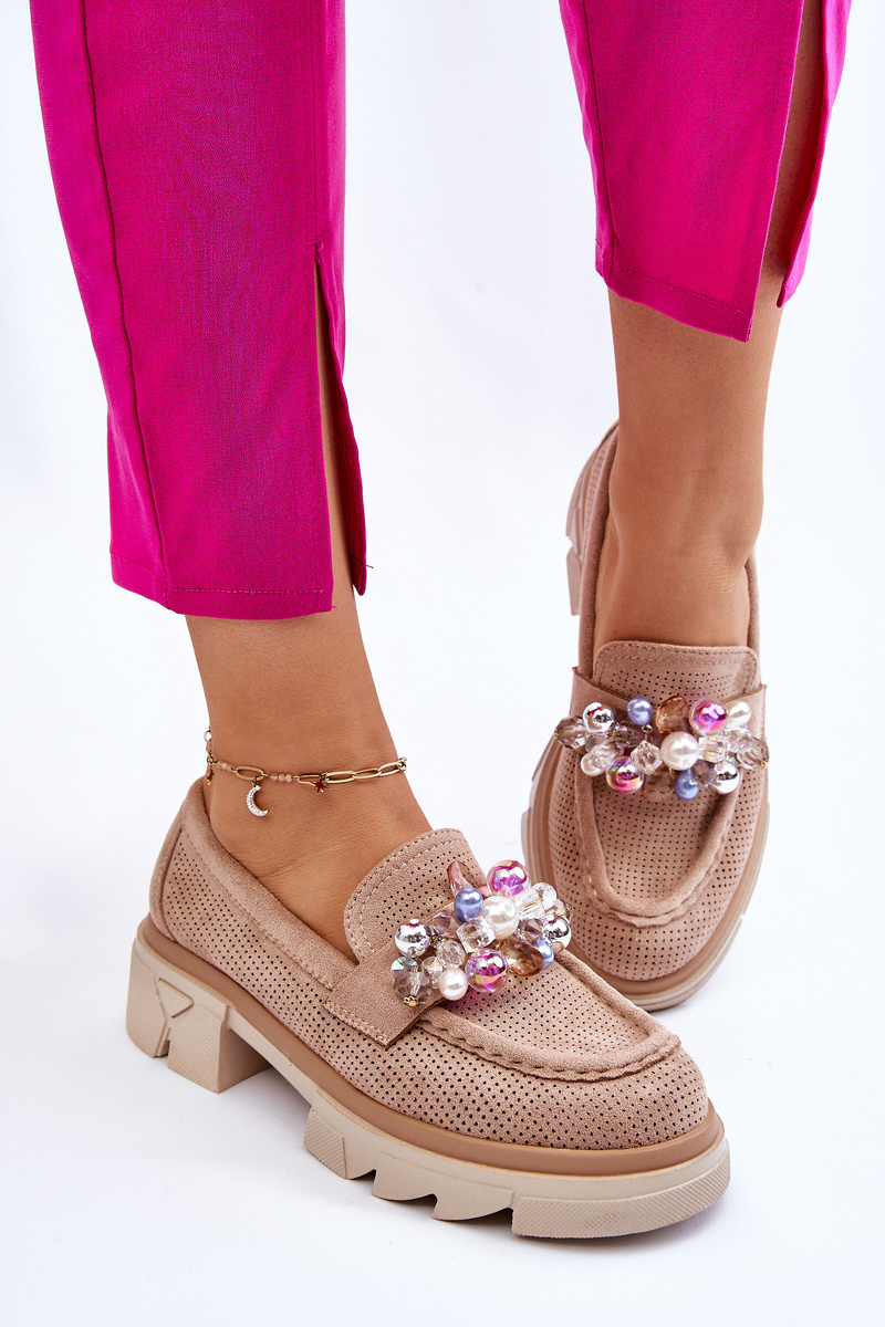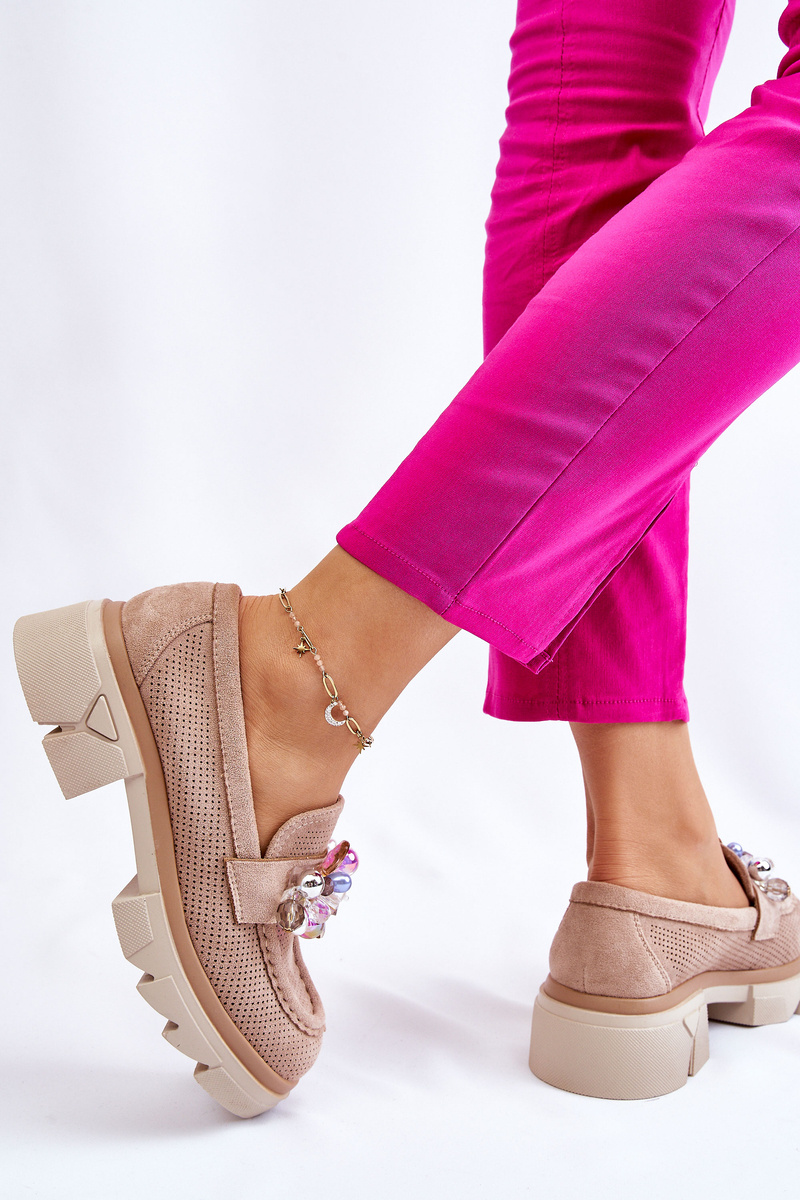 Fashionable, women's loafer-style shoes have been set on a massive, flat heel and platform. Decorated with beads on the front. Made of a material resembling eco suede. The soft insole made of natural leather will ensure comfort during use. Upper in an openwork pattern. A great model for many styles. Perfect for the spring-autumn season! When choosing a size, please refer to the size chart.