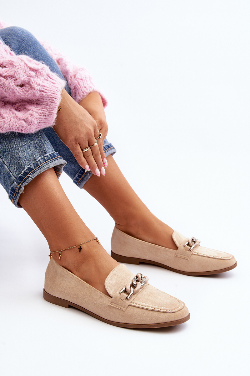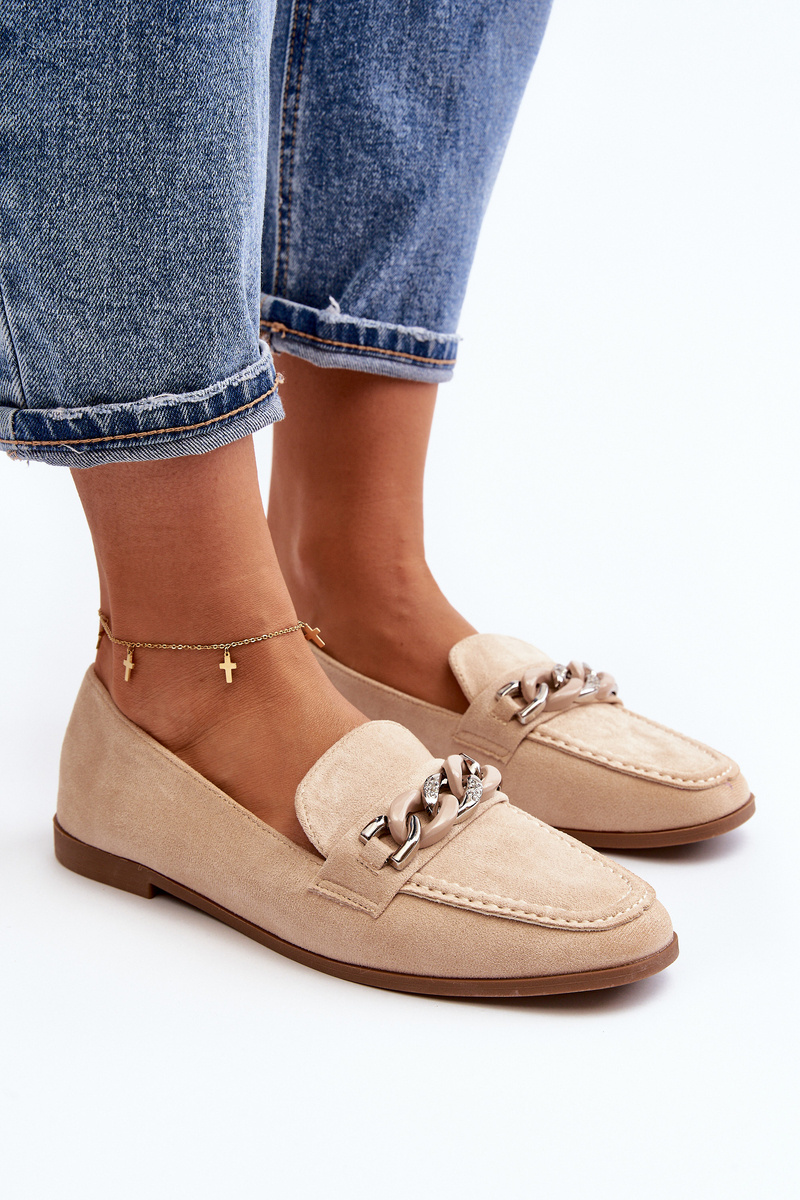 Women's moccasins made of fabric imitating suede. Set on a flat heel. This model has a chain decoration. Rounded toes. The soft, eco leather insole will guarantee comfort even when worn all day long. You can match this stylish model with almost any spring outfit! When choosing a size, please refer to the size chart.