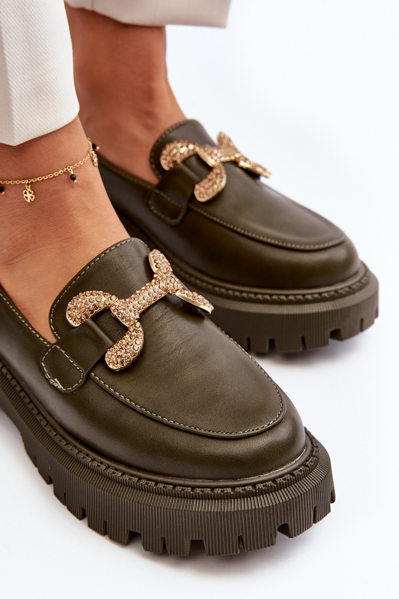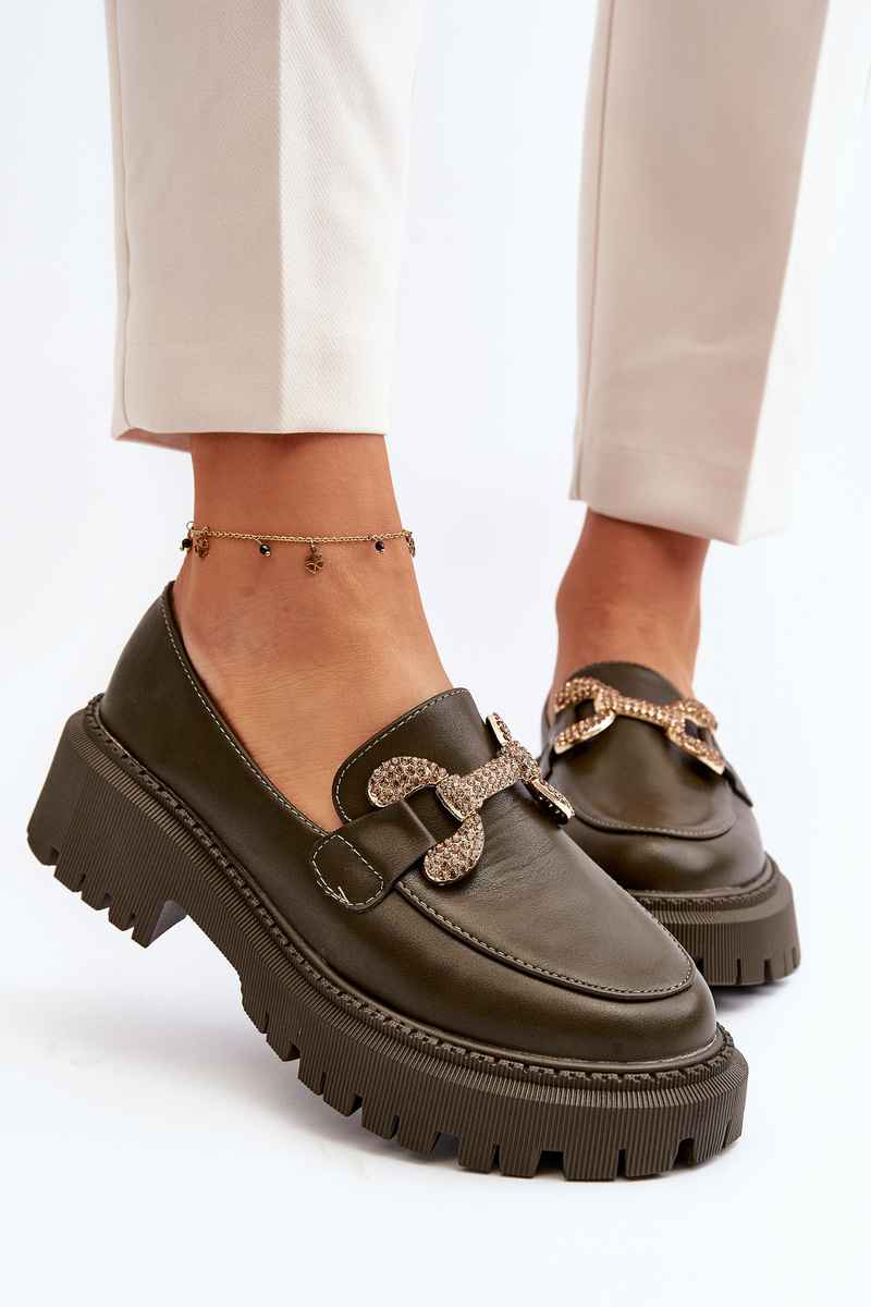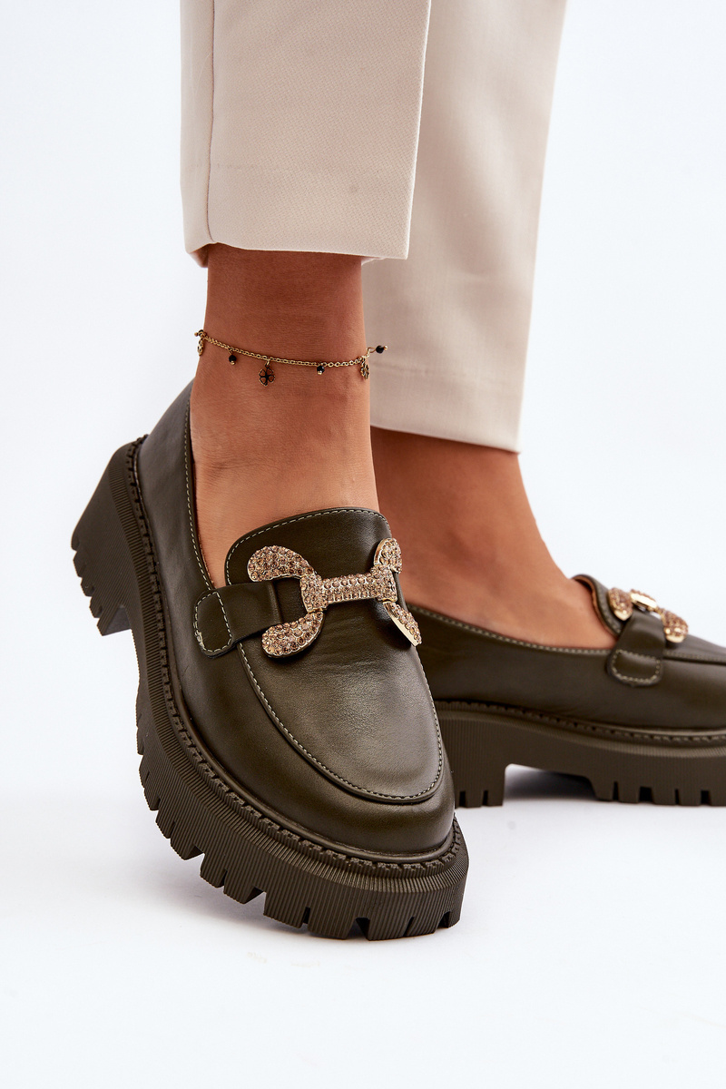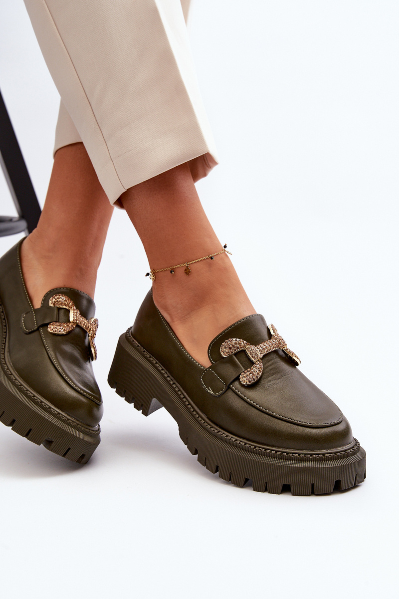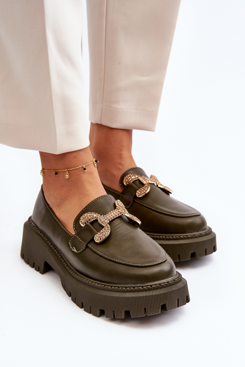 Women's moccasins made of eco leather. Set on a massive, flat heel and thick sole. This model has rounded toes and a gold decoration at the front. You definitely should have them in your wardrobe! When choosing a size, please refer to the size chart.