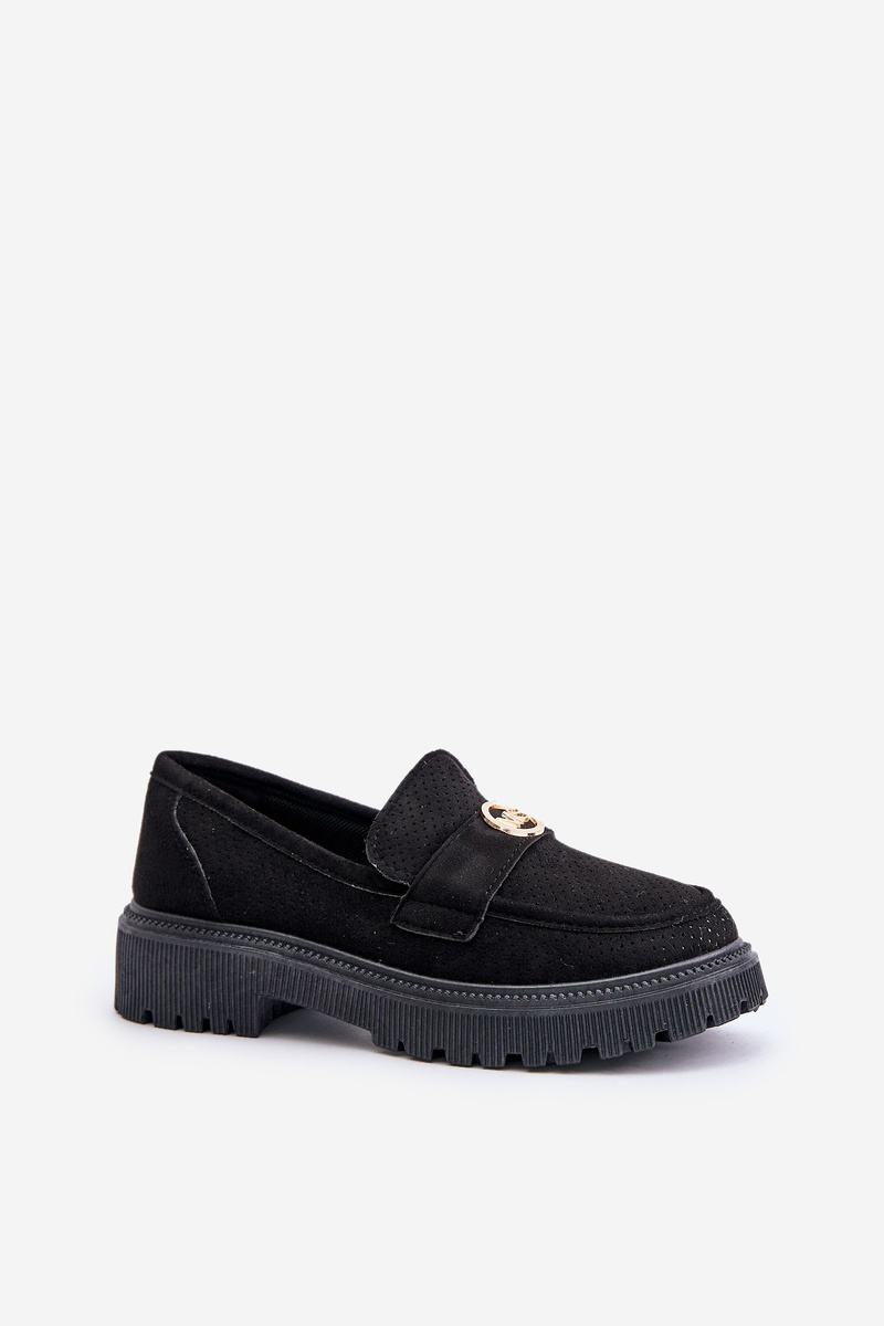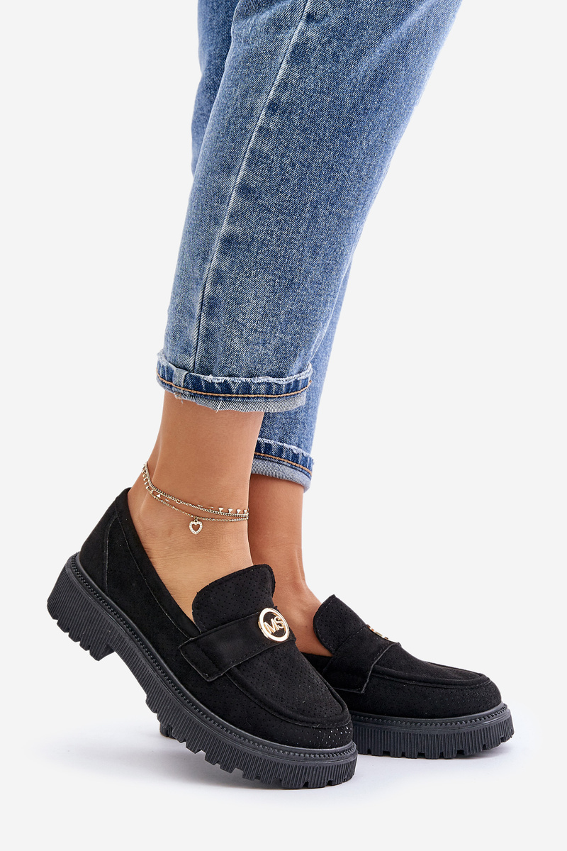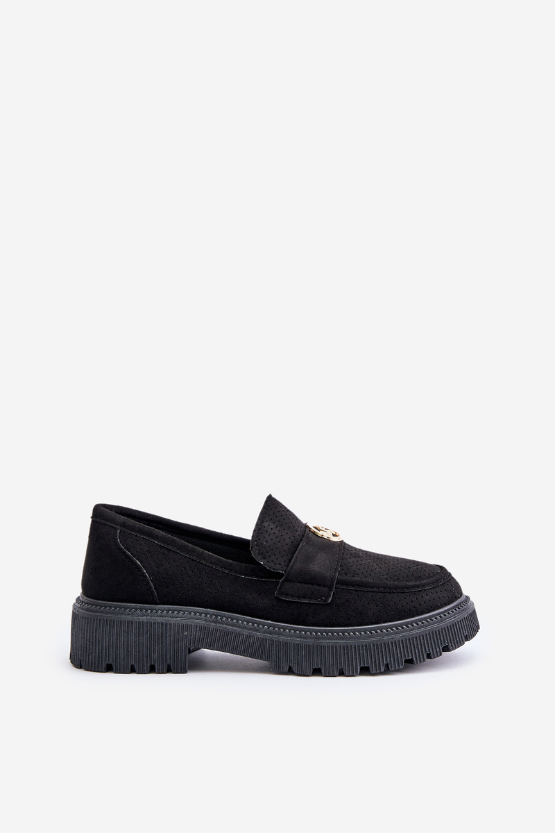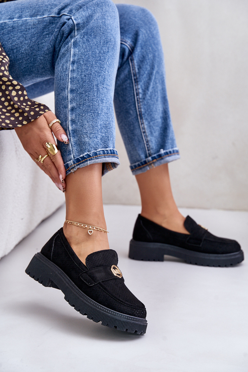 Women's moccasins made of eco suede. Set on a platform and flat heel. The toes are rounded. This model features a small golden detail that adds elegance. A fashionable style that perfectly complements outfits with trousers and dresses! When choosing a size, please refer to the size chart.