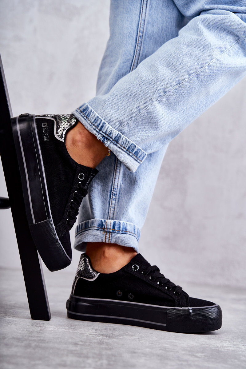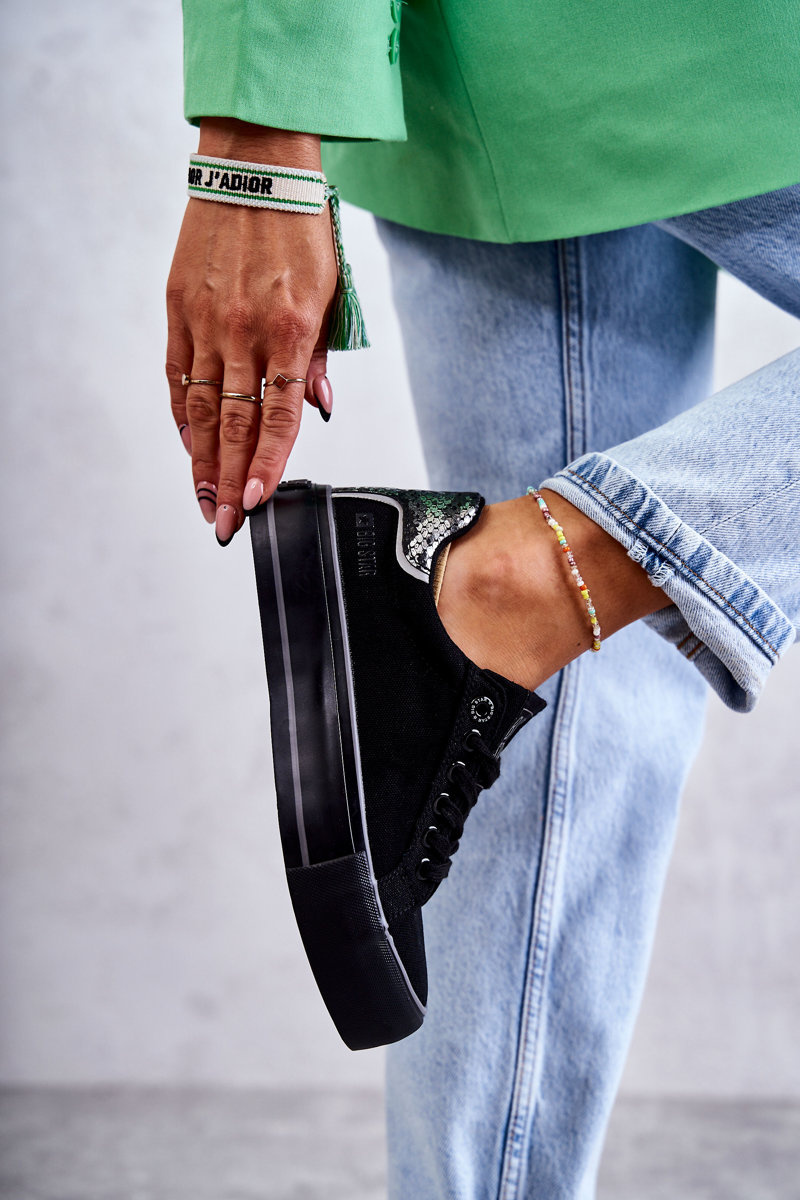 Women's sneakers are made of a textile material with an eco-leather insert. The model is tied with flat laces. The shoes are mounted on a flat sole with a non-slip sole. A soft, material insole will ensure comfort during use. The heel counter is slightly stiffened. This model will be perfect for jeans or longer skirts. When choosing a size, please follow the size chart.
