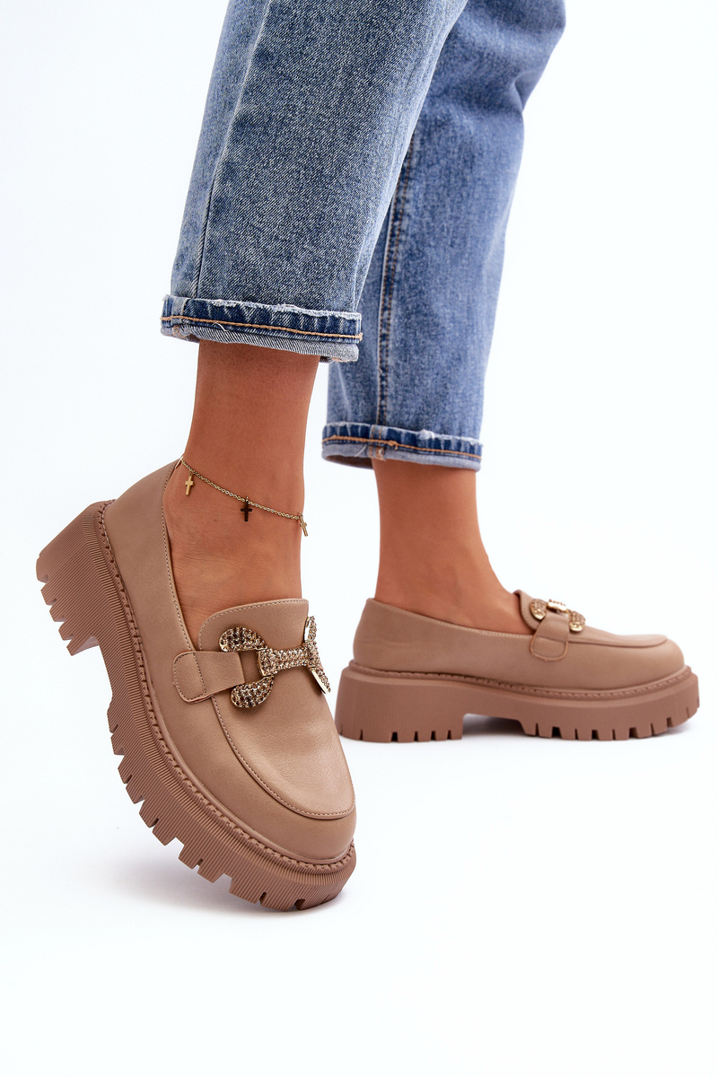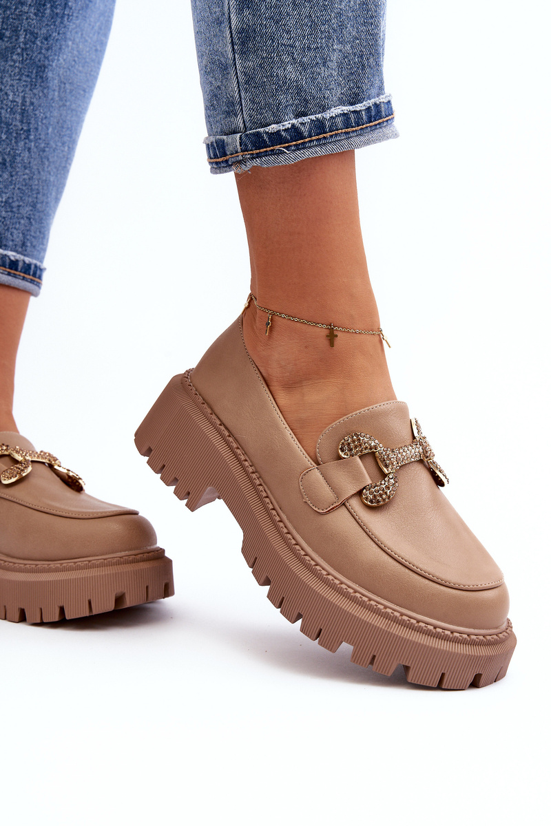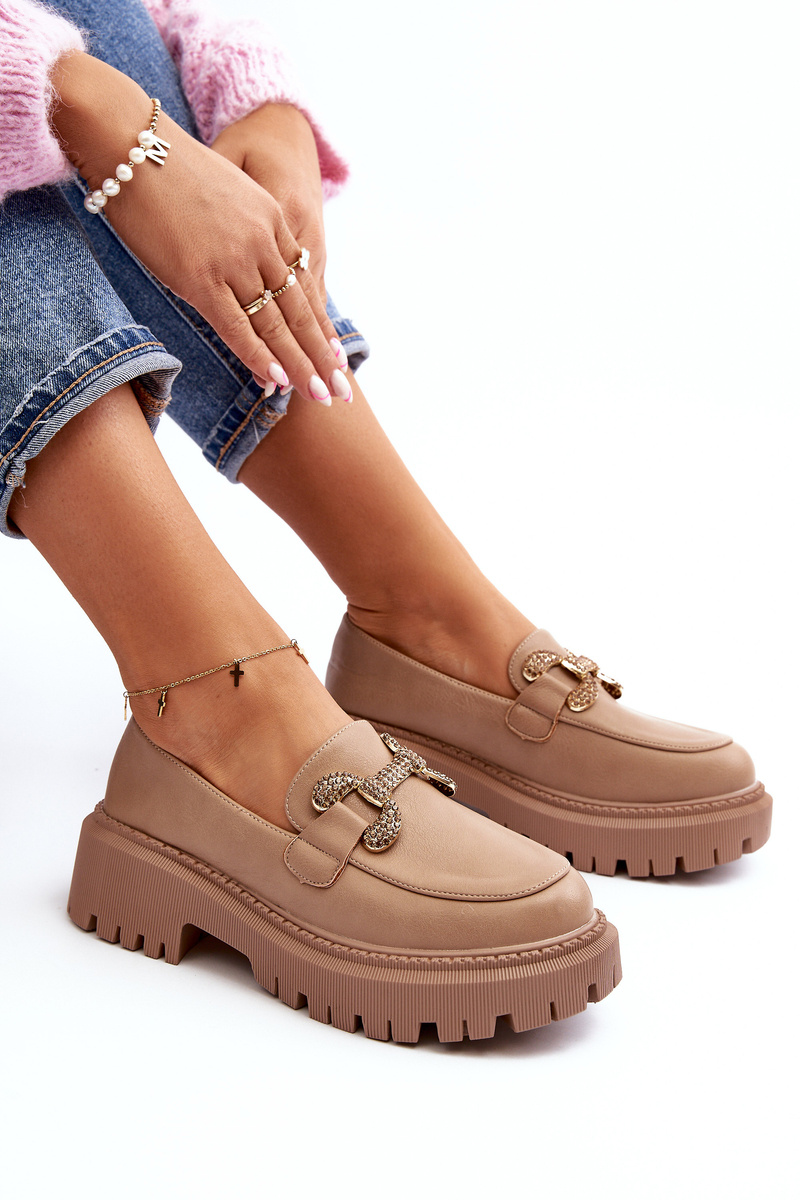 Women's moccasins made of eco leather. Set on a massive, flat heel and thick sole. This model has rounded toes and a gold decoration at the front. You definitely should have them in your wardrobe! When choosing a size, please refer to the size chart.