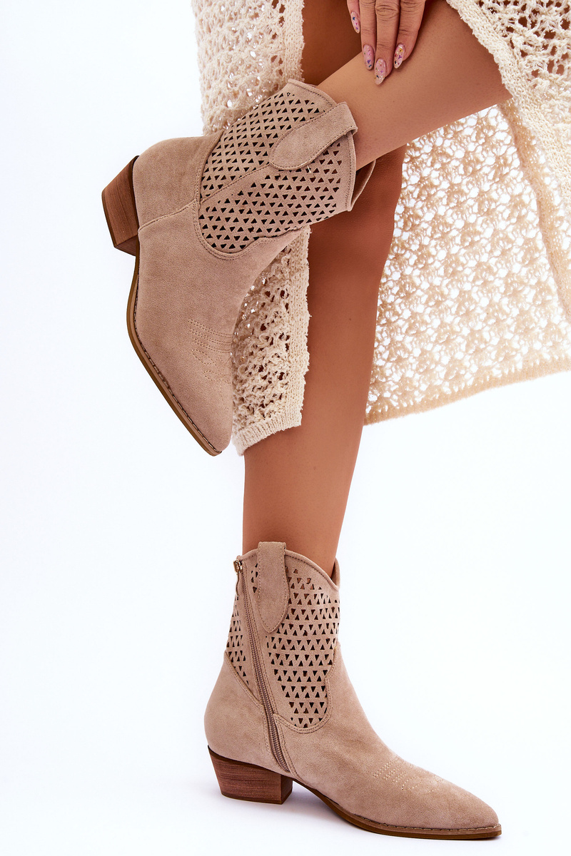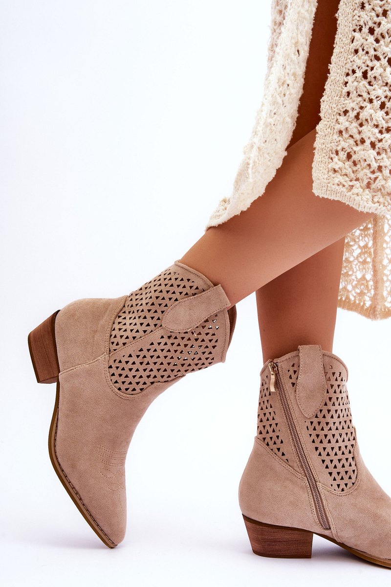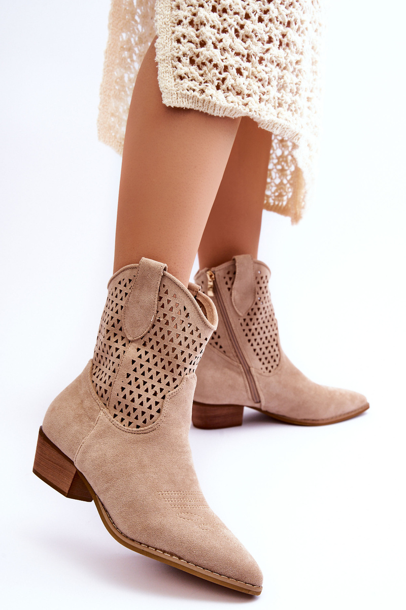 Great, women's boots made of ecological suede with an upper in an openwork pattern. The cowboy boots have a stiffened heel counter and a material insert. Set on a flat heel with a pointed toe. They have decorative stitching on the front. This model is fastened with a zipper on the side of the upper. You absolutely should have them! When choosing a size, please refer to the size chart.