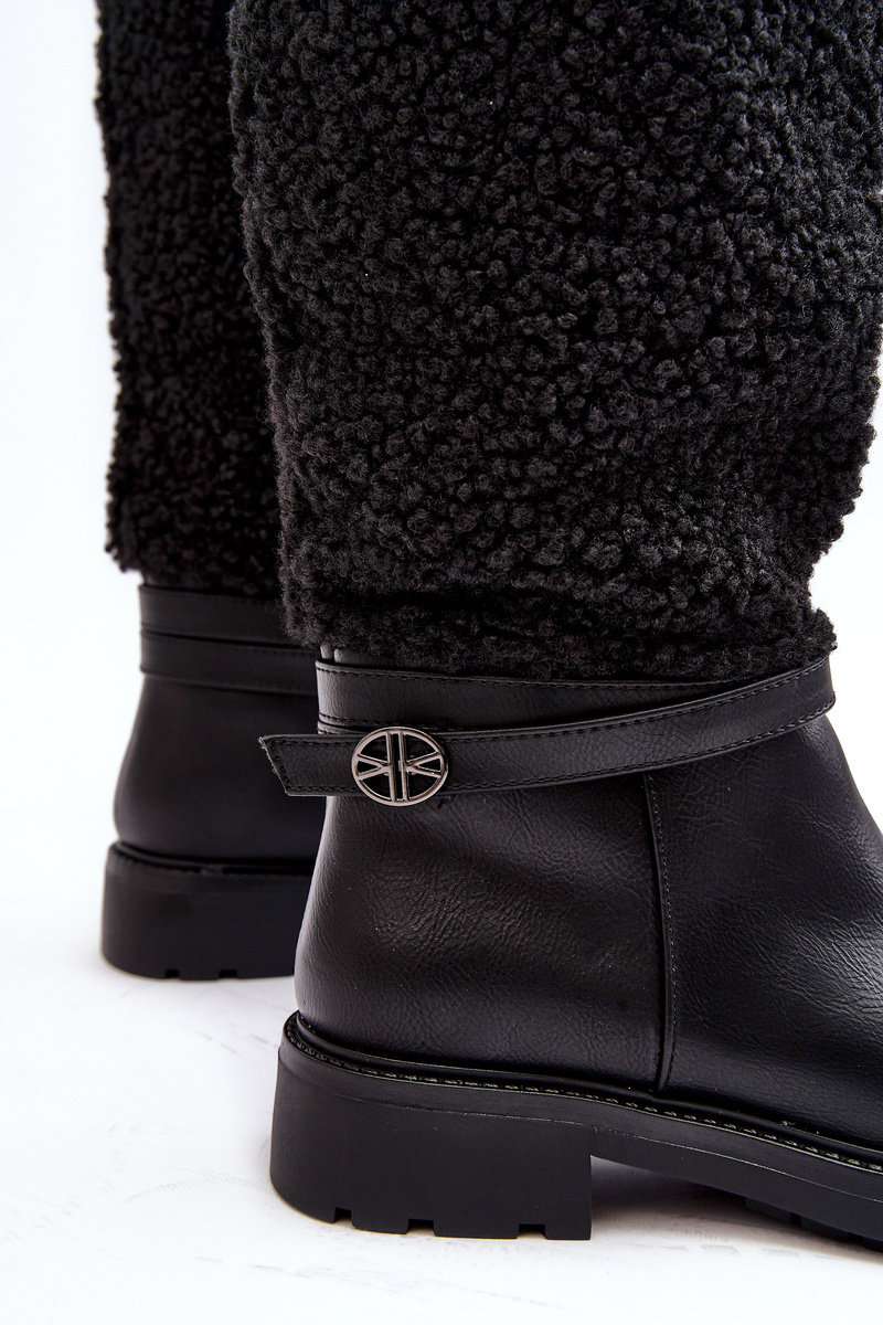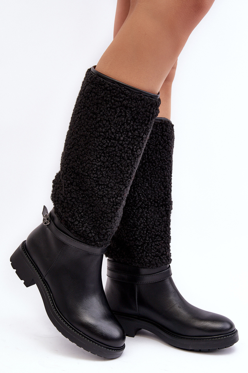 Women's flat, stable-heeled boots. The shaft reaching above the knee enriched with lamb fur lining and a strap. Rounded toes. Stiffened heel. The interior of the shoes is insulated with shoe lining, providing warmth on colder days. You definitely should have them! When choosing a size, please refer to the size chart.