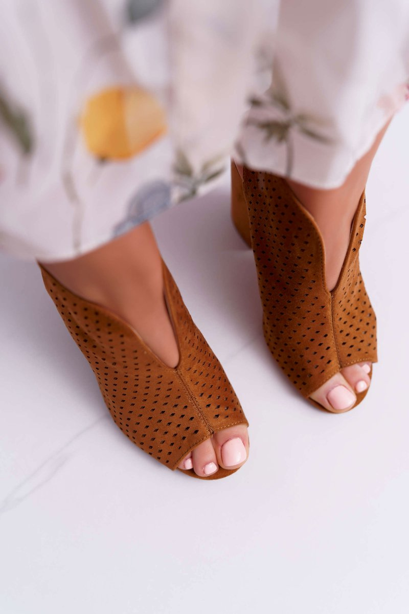 Fashionable women's sandals made of eco-suede. Openwork finish, peep toe nose and stable post. These shoes have everything we've always dreamed of. Perfect fit thanks to the sewn-in elastic band. When choosing the size, please suggest the size chart, which is available after hovering over or clicking on the size.