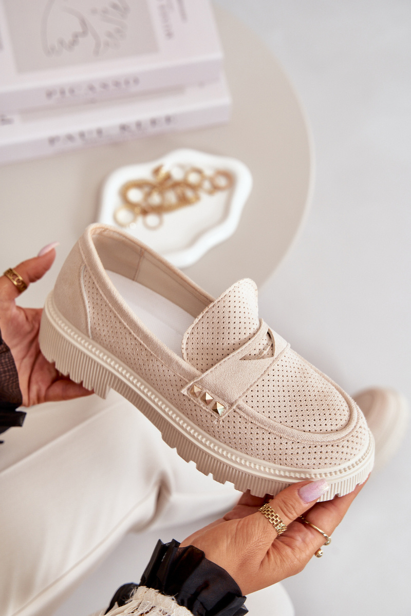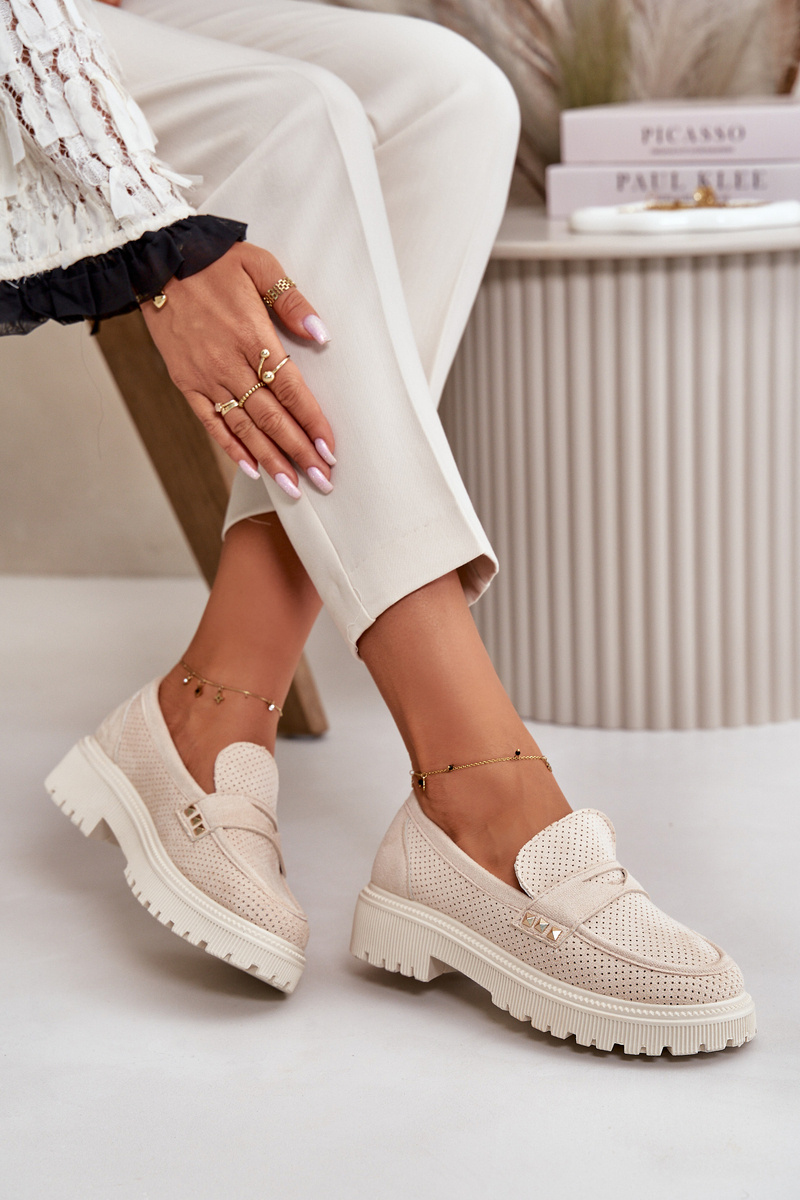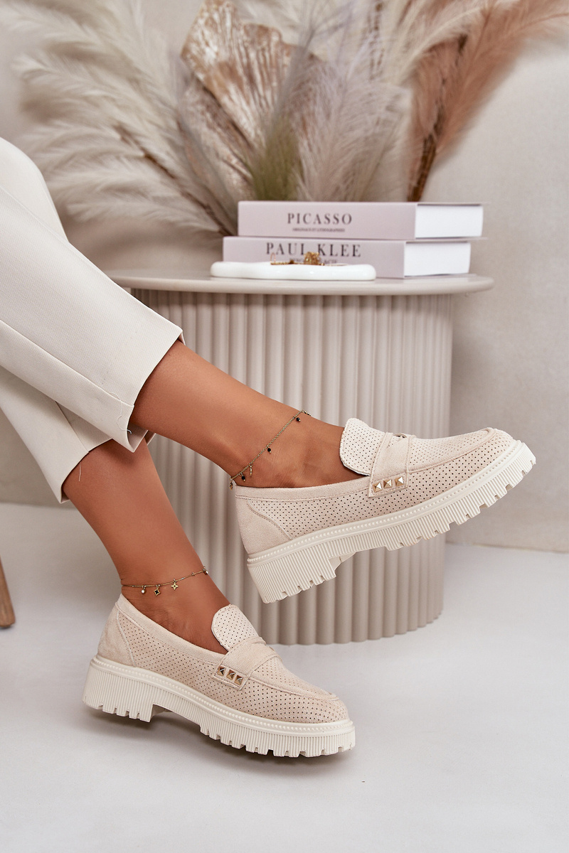 Women's moccasins made of eco suede. Set on a flat heel and platform, they provide comfort for all-day wear. The toes are rounded, giving them a classic look. This model is not only fashionable but also practical, thanks to the perforated upper that allows the foot to breathe. These moccasins are perfect for both everyday and more elegant styles! When choosing a size, please refer to the size chart.