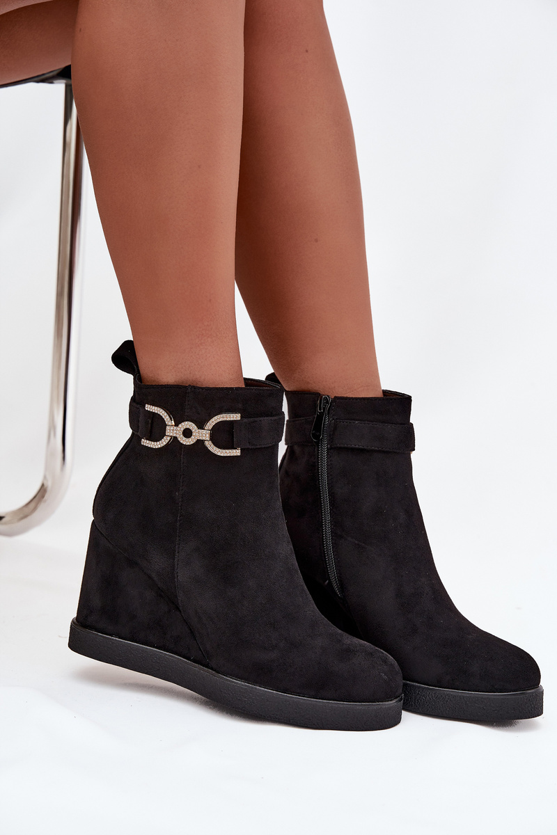 Women's eco suede ankle boots are a stylish option for women who value comfort and fashionable appearance. Set on a platform, they provide comfort and subtly enhance the silhouette, while the rounded toes give them a classic character. The model features a strap with an ornamental detail placed at the top of the shaft, adding an elegant accent. The side zipper makes putting on and taking off easier, making these shoes a practical choice for everyday wear. Please refer to the size chart when selecting your size. When choosing a size, please refer to the size chart.
