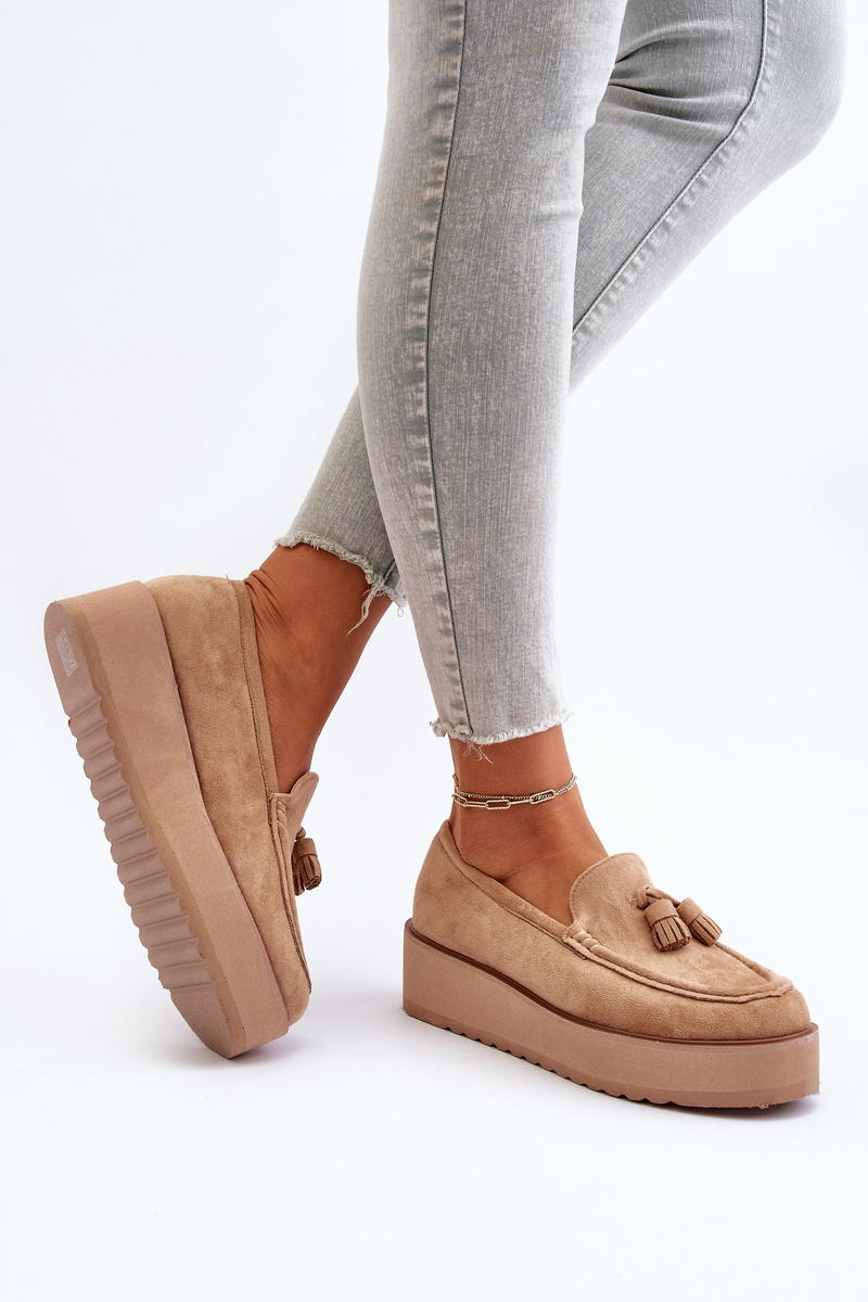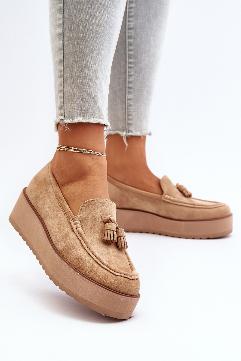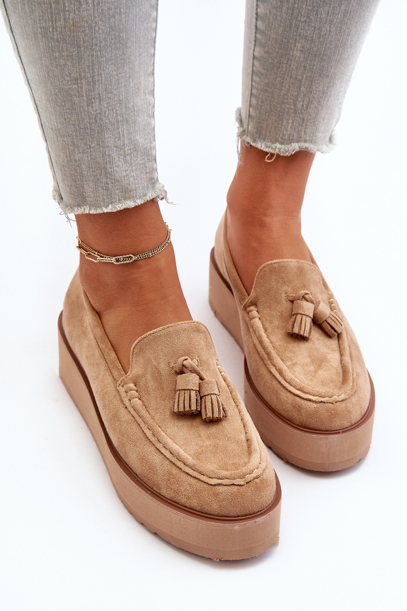 Classic women's moccasins set on a platform. Decorative fringes on the front give them a unique style. Rounded toes, slightly reinforced heel. Perfect for both casual and more sophisticated stylings, these moccasins will be a great addition to your wardrobe! When choosing a size, please refer to the size chart.