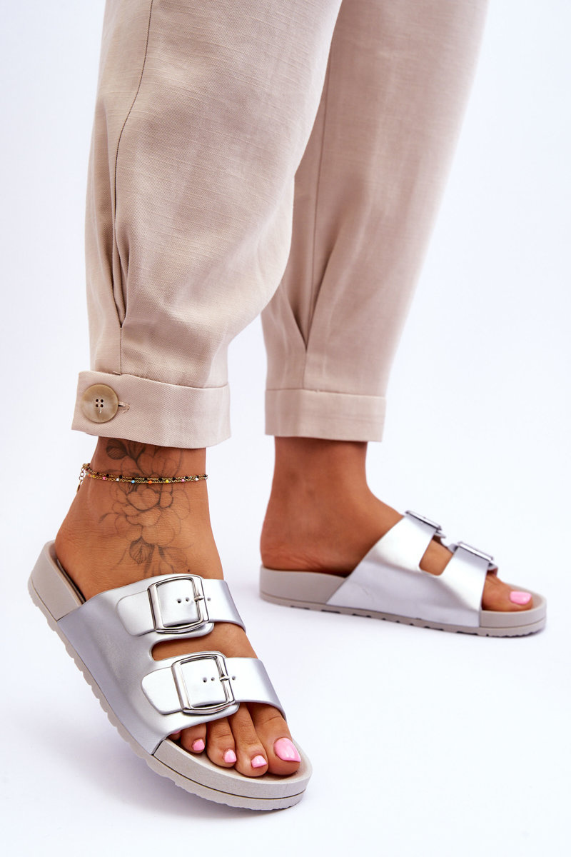 These women's sandals have been made from eco leather. This model has two wide straps with buckle closure that can be adjusted. The sandals are perfect for summer walks and everyday shopping trips. The eco leather insole provides comfort and cushioning. The outsole is made of synthetic material.