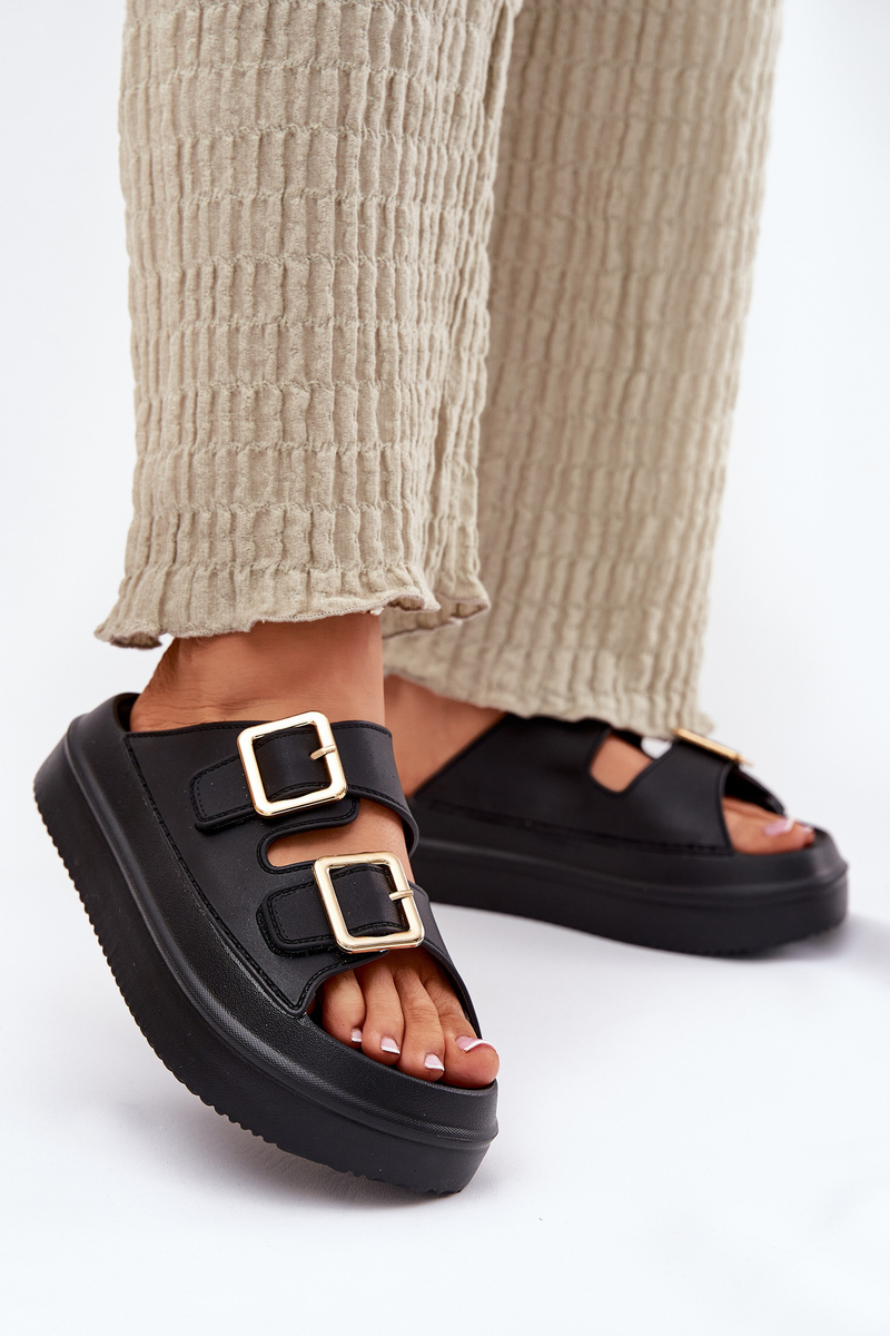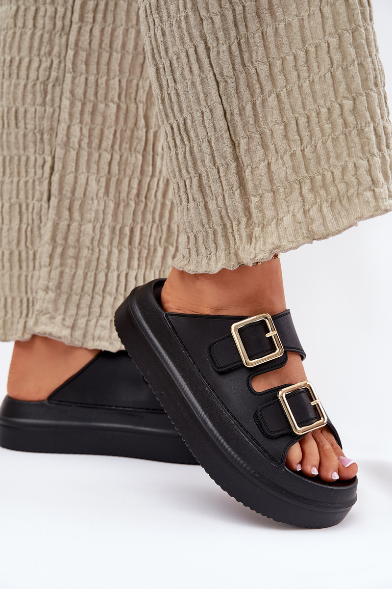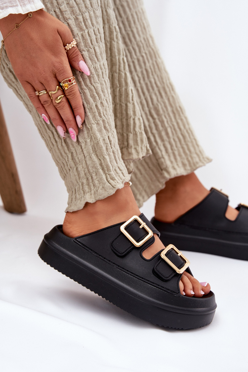 Women's Platform Slippers With Golden Buckles Black Zorila