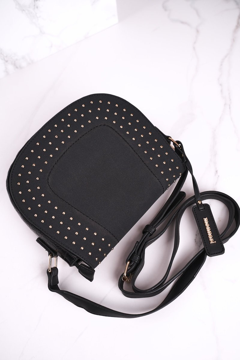Small women's Monnari purse. The bag has an animal print, additionally decorative rivets around the suede flap. Hanging on a regulated belt, single chamber, with a bright lining inside. We recommend the model for daily stylization.