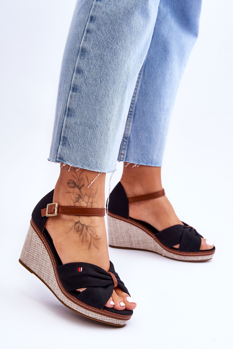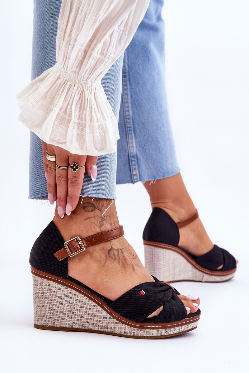 Women's sandals with a fashionable, braided wedge heel are a classic among women's summer footwear. The insert and the top are made of fabric. The clasp has been stiffened. The shoes fasten with an adjustable strap with a buckle. The sole in these sandals is made of rubber material and is non-slip. When choosing a size, please refer to the size chart.