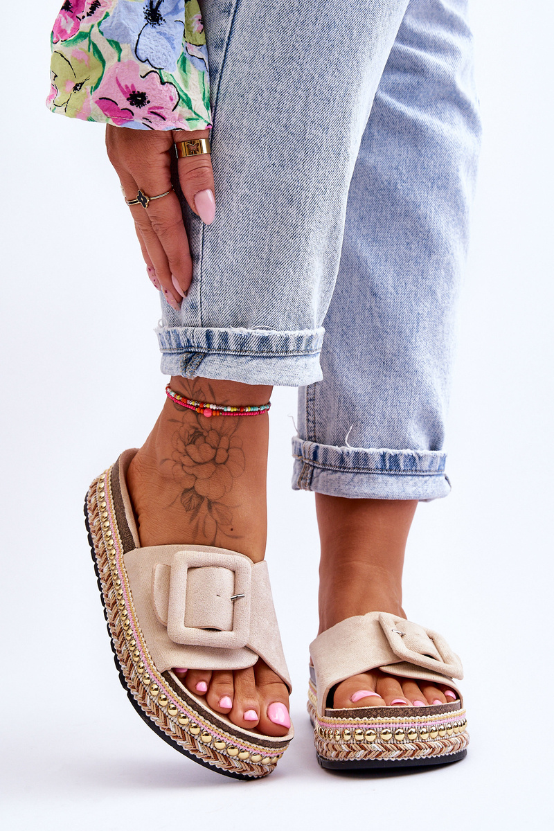 Unique, women's flip flops are mounted on a platform decorated with rivets and colorful braids. A classic, slip-on model with a decorative buckle and an adjustable strap that will allow you to adjust the footwear to the length of the leg. The profiled insole will ensure comfort in use. A great model for many styles! When choosing a size, please refer to the size chart.