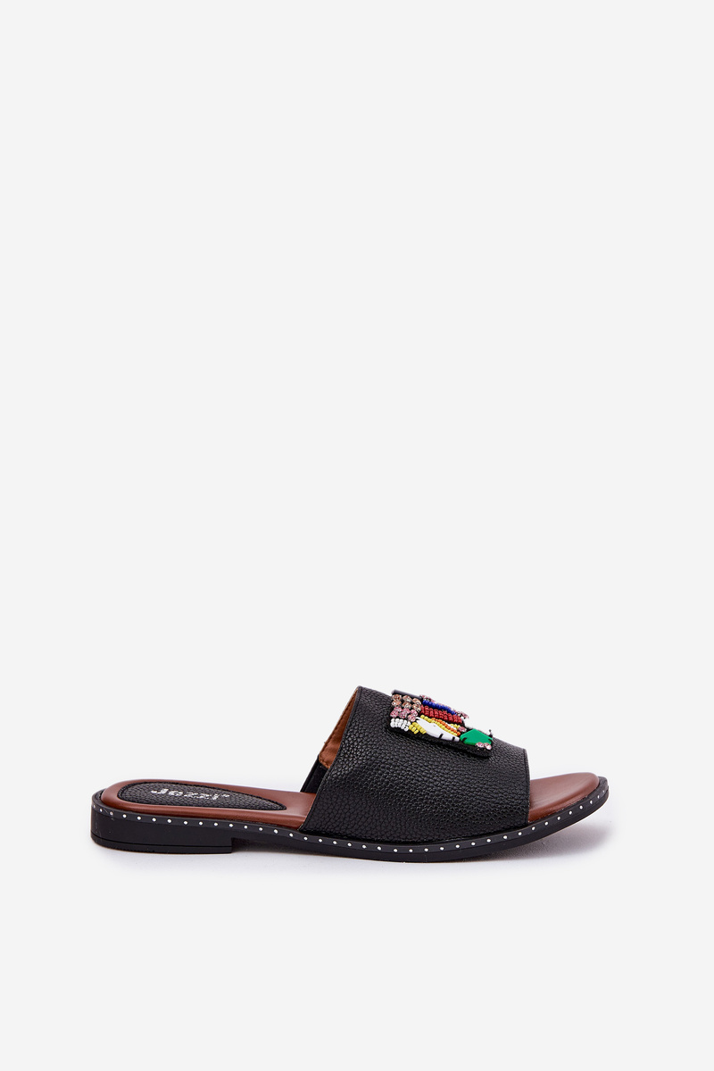 Women's eco-leather slippers from the brand Jezzi. Set on a flat heel, they provide comfort and lightness all day long. There is a decoration on the strap at the front that adds unique charm. The soft insole guarantees comfort. These slippers will be a perfect complement to both casual and elegant styles. Ideal for everyday outings on summer days! When choosing a size, please refer to the size chart.