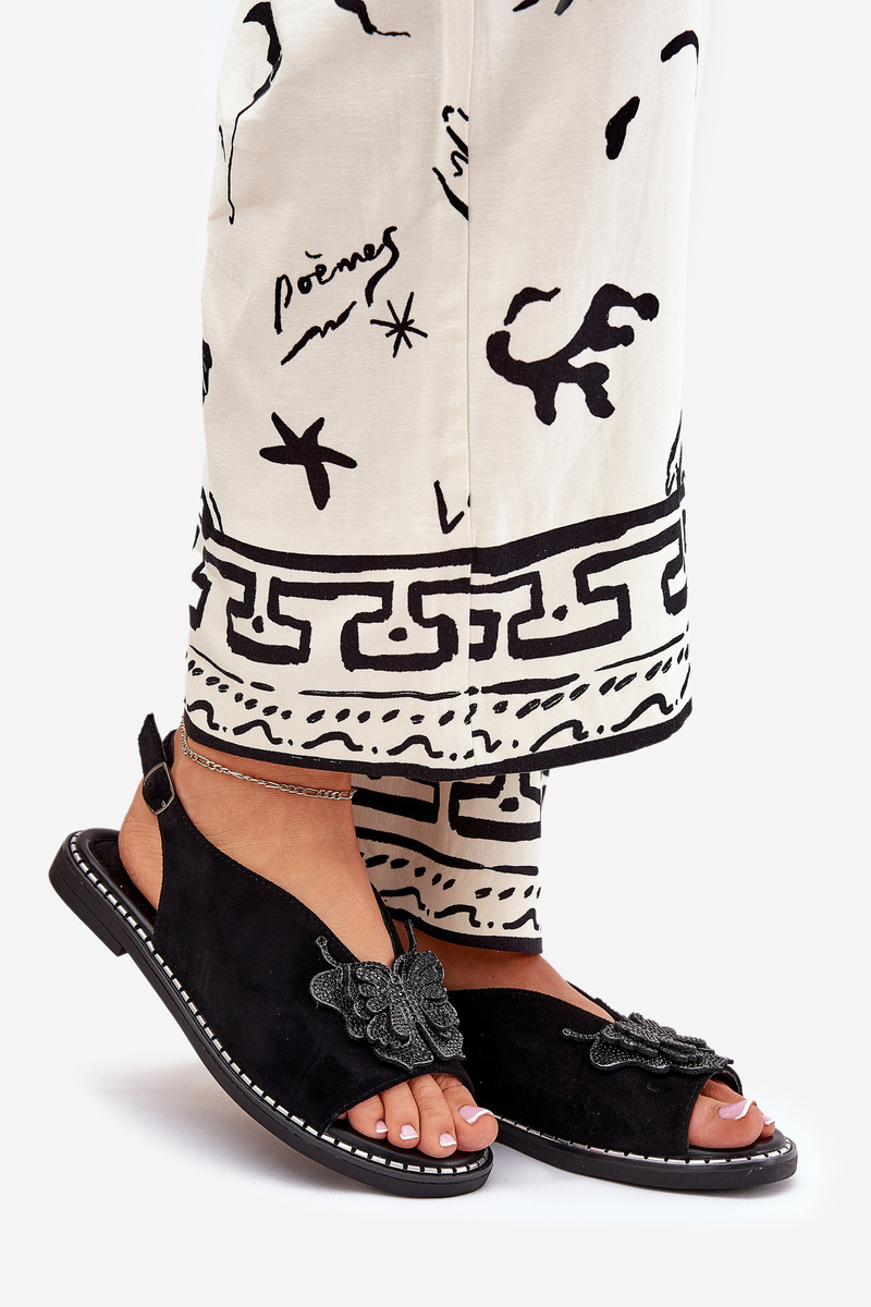 Women's sandals from the Jezzi brand, made of high-quality eco suede. This model features a front decoration that adds a unique character. Set on a flat heel, they provide comfort thanks to the soft insole. Fastened with an adjustable strap with a buckle. Ideal for various occasions and evening outings, they pair perfectly with both dresses and trousers, highlighting feminine elegance. When choosing a size, please refer to the size chart.