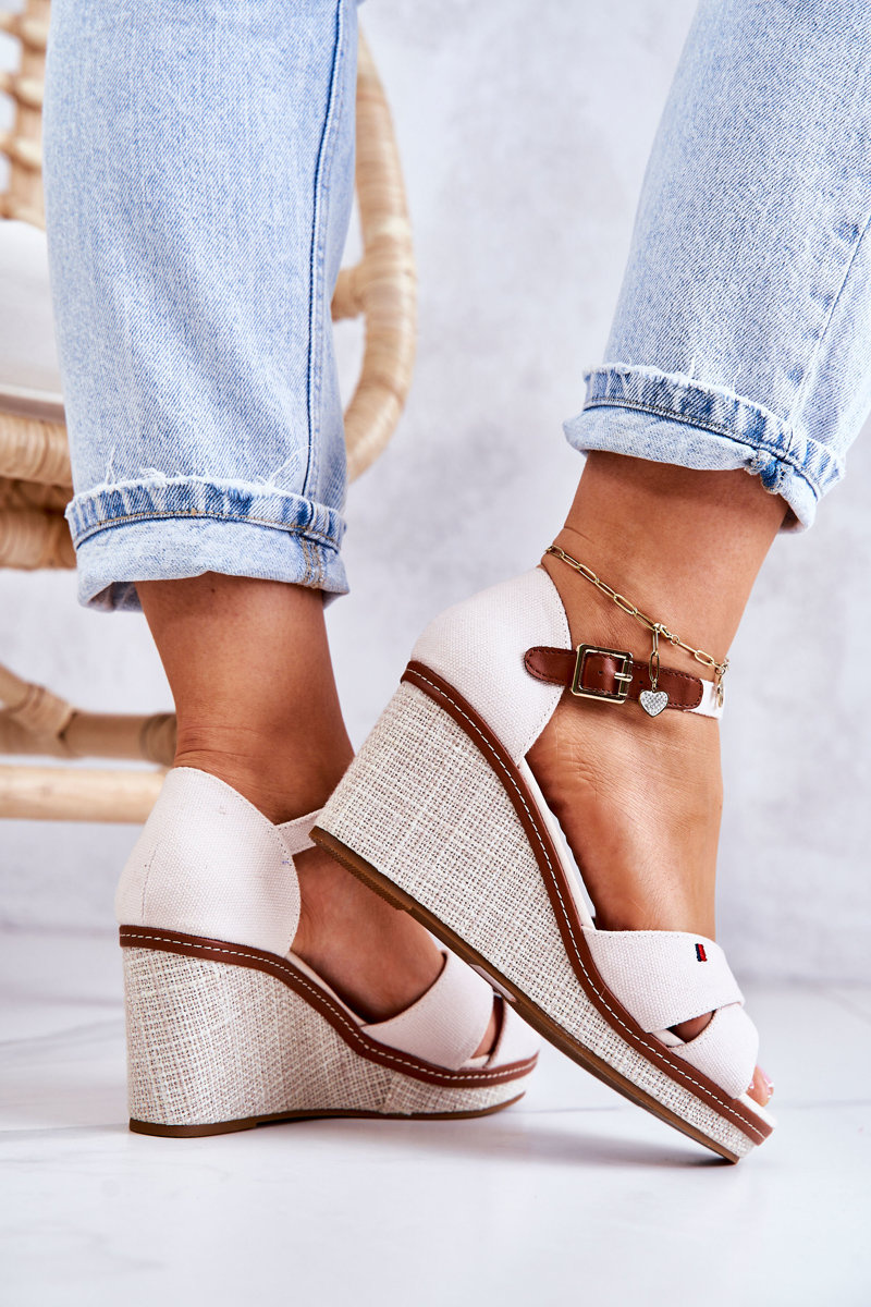 Unique wedge sandals with a braid. The shoes are made of textile material. Stiffened heel. A soft insole made of a combination of eco leather and textile material will take care of your comfort during use. Fastened around the ankle with an adjustable strap with a buckle. Decoration with thread on one of the stripes. The shoes have open toes and a covered heel. Thanks to this heel, the shoes are more stable than traditional high heels. A great model for summer days! When choosing a size, please use the size chart.