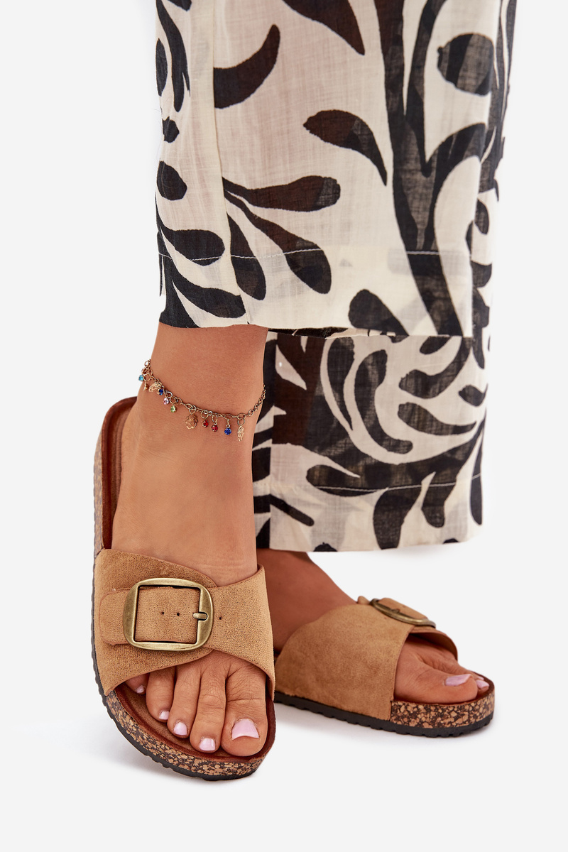 Ladies' sandals made of eco-suede. Set on a cork platform. They feature a buckle with an adjustable strap that allows for a perfect fit to the foot. The contoured insole provides comfort all day, and their simple appearance makes them perfect for everyday styling. Ideal for summer days, they match dresses, skirts, or pants, adding lightness and style to every outfit. When choosing a size, please refer to the size chart.