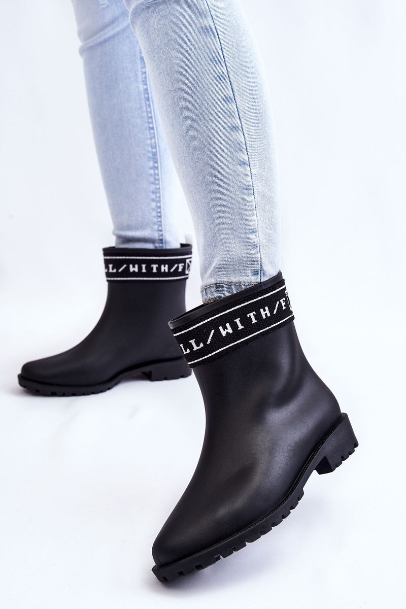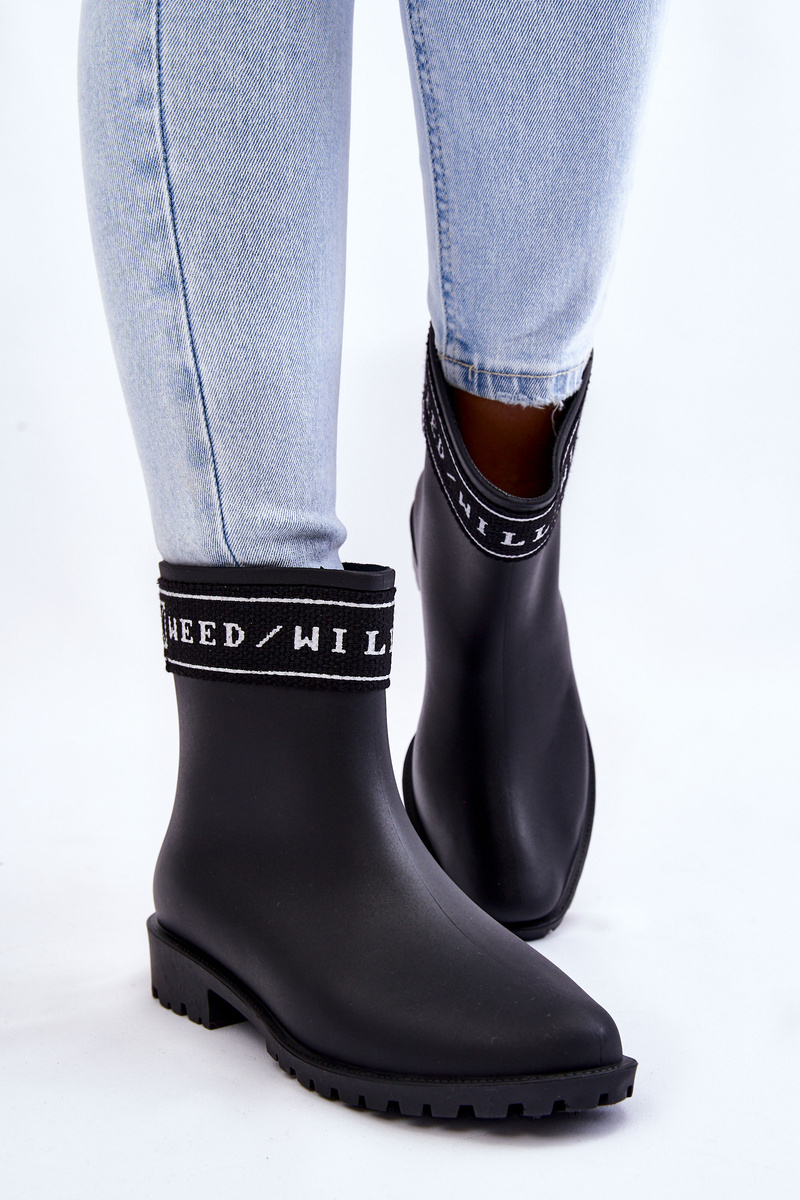 Classic, women's wellingtons are made of rubber material. This model has been decorated with a stripe with an inscription at the top of the upper. The removable insole is made of fabric. The shoes are set on a rubber sole with a flat heel. In addition, there is a bootstrap at the back, i.e. a loop that facilitates putting on and taking off shoes. When choosing a size, please refer to the size chart.