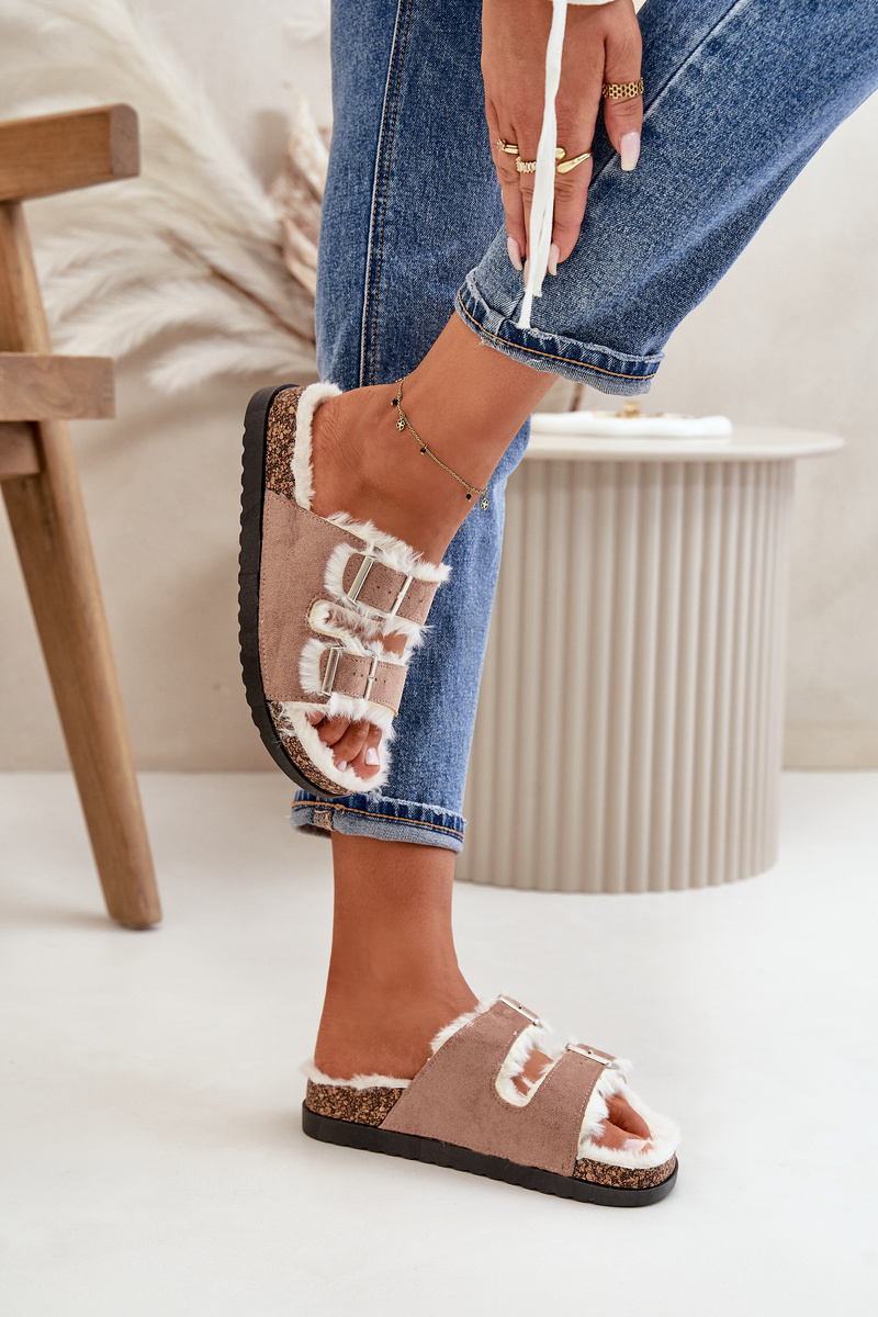 Women's Slippers Slides With Buckles And Fur Beige Ezilena