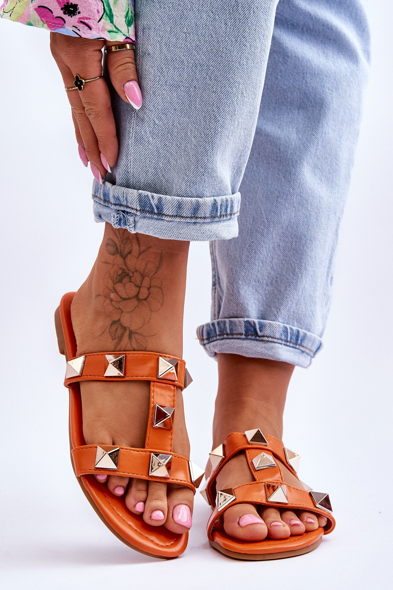 Women's classic flip-flops are made of eco leather. They have fashionable cutouts on the sides. In addition, they were decorated with large studs. The flip-flops are set on a flat heel with a rubber, non-slip sole. This model will surely appeal to every woman during hot days. The soft, eco-leather insole will allow for comfortable use of the footwear even throughout the day. When choosing a size, please refer to the size chart.