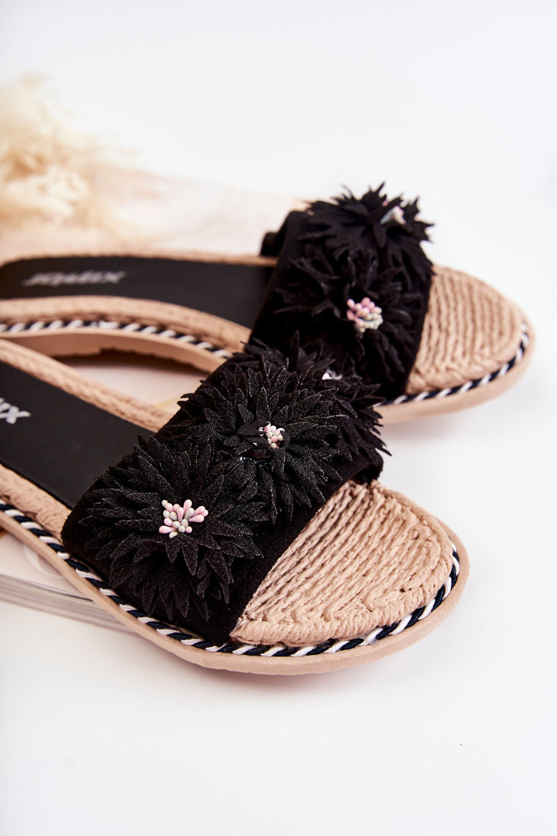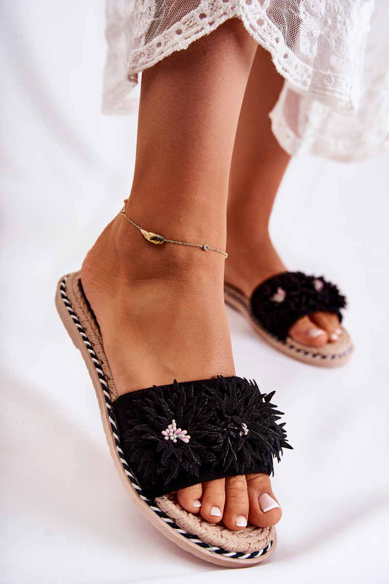 Classic slippers with beautiful, decorative flowers on the front. Made of textile material. The insole and sole are made of rubber material. Flip-flops set on a flat heel, thanks to which they are very comfortable to use. Fashionable cut with an open, rounded toe. Decorative string around the sole. When choosing a size, please use the size chart.