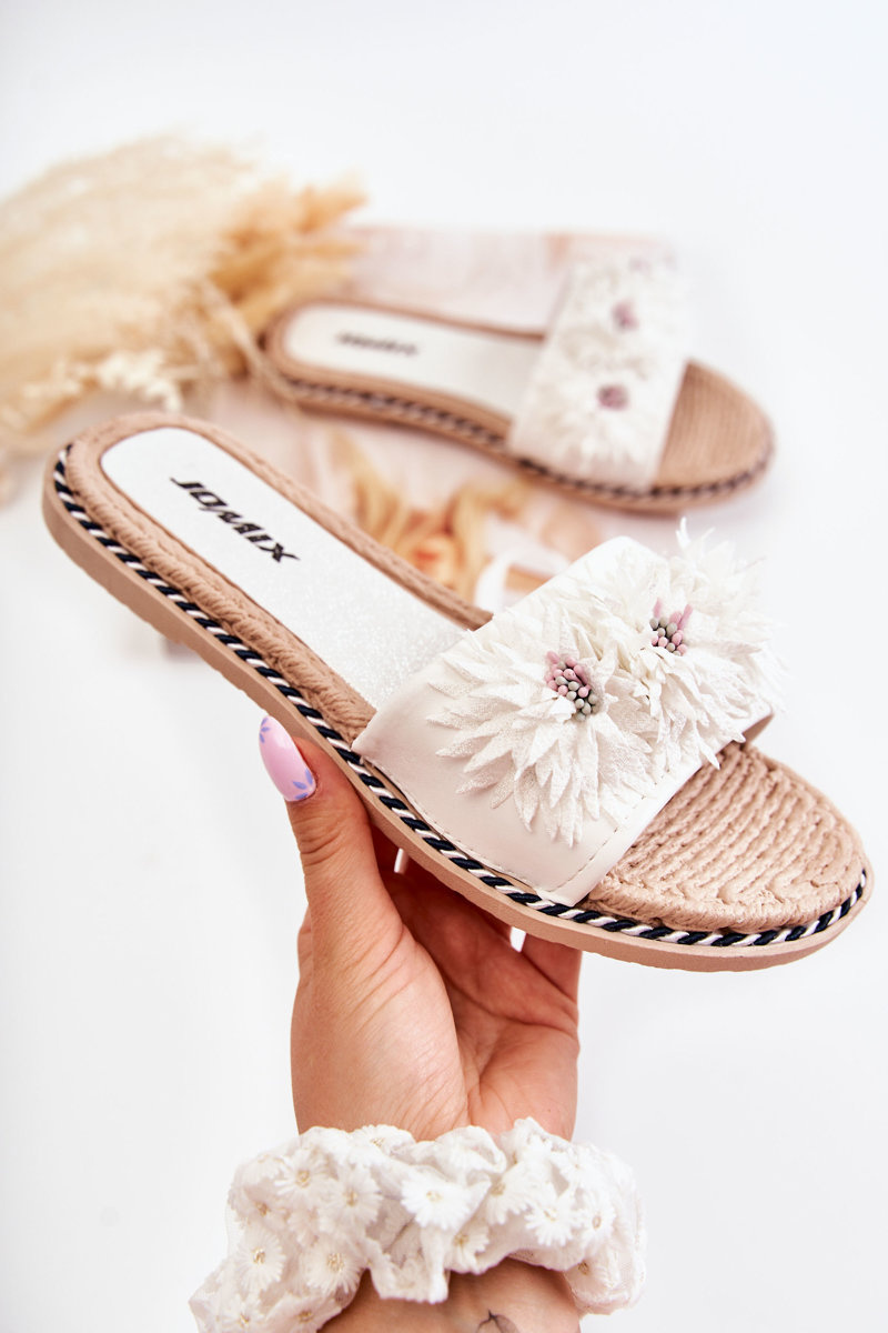 Classic slippers with beautiful, decorative flowers on the front. Made of eco leather. The insole and sole are made of rubber material. Flip-flops set on a flat heel, thanks to which they are very comfortable to use. Fashionable cut with an open, rounded toe. Decorative string around the sole. When choosing a size, please use the size chart.