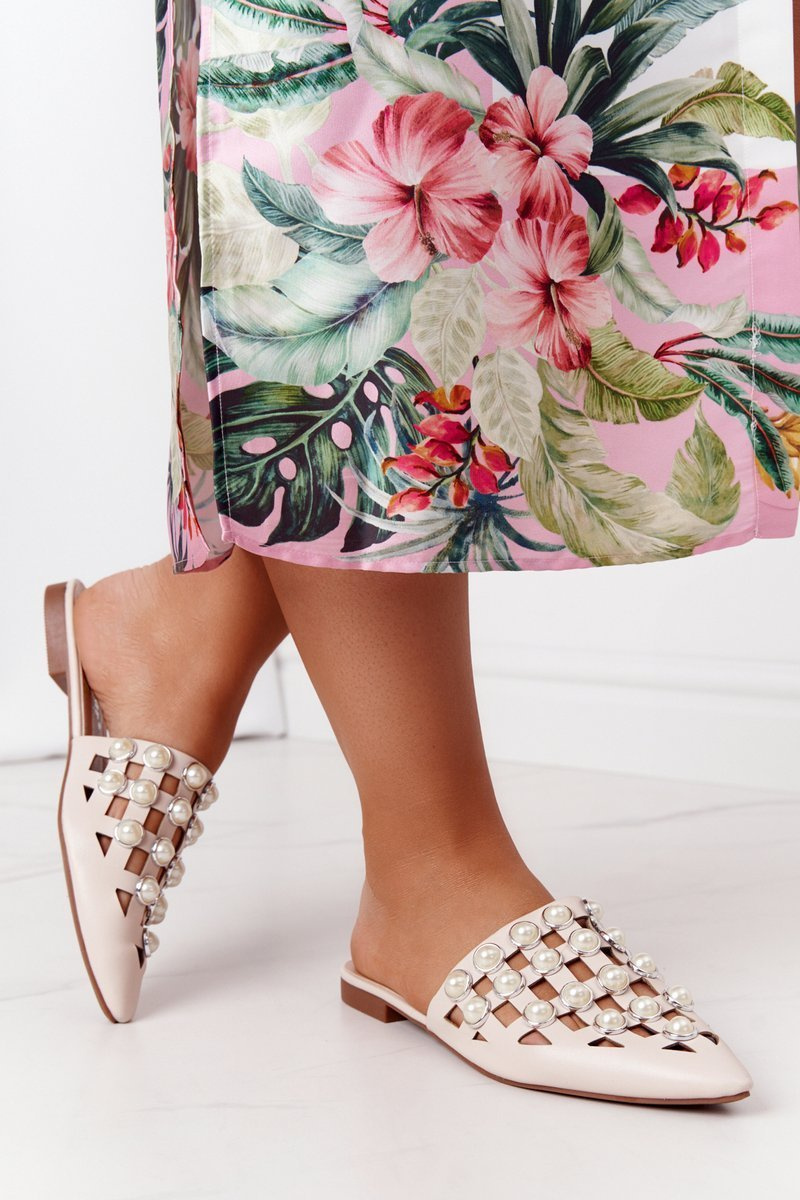 Elegant women's slippers with an upper decorated with pearls. The slippers have a soft eco-leather insole and a non-slip sole. A fashionable cut will complement many summer stylizations! Be sure to check out our entire collection of women's slippers. When choosing a size, please use the size chart.
