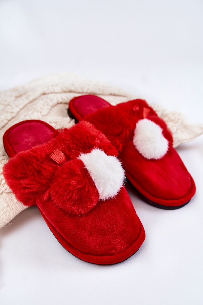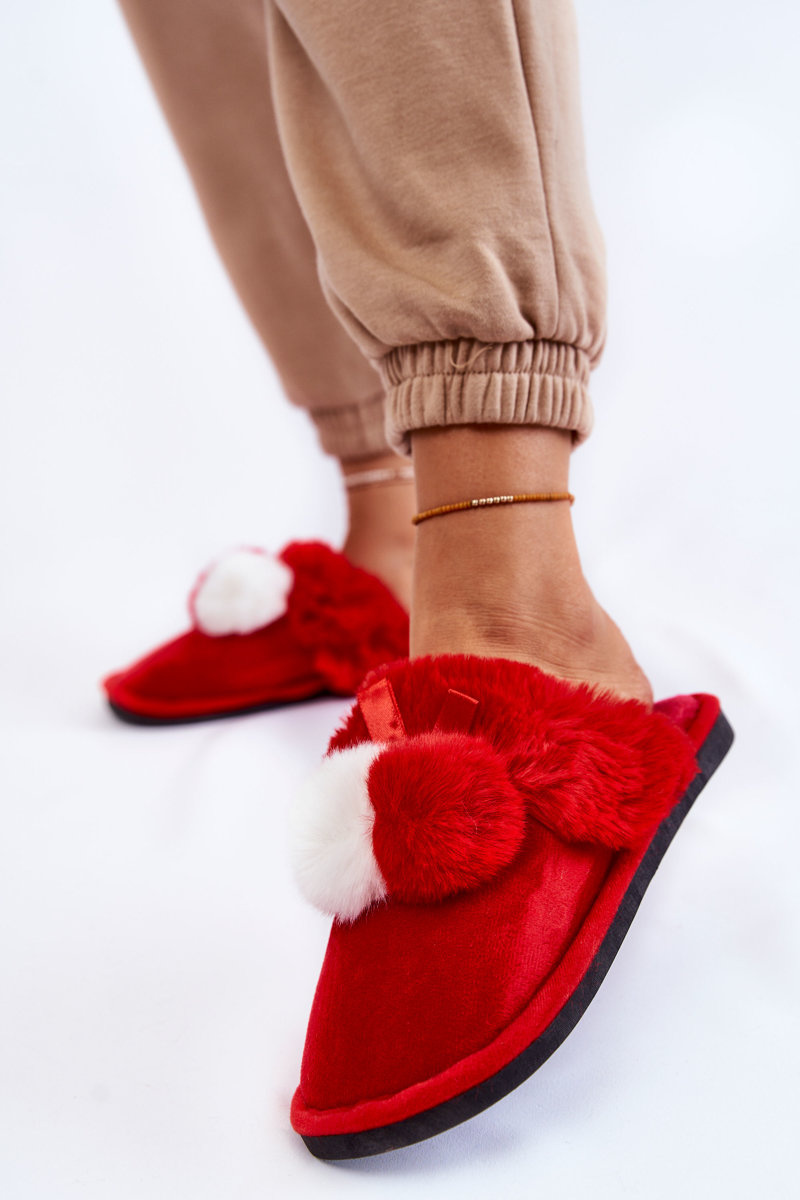 Women's slippers are made of pleasant to the touch fabric. Additionally decorated with pompoms and fur. Inside insulated with a footwear blanket. The insert is soft and comfortable during use. This model is perfect for colder days. The slippers were placed on a flat sole made of rubber material.