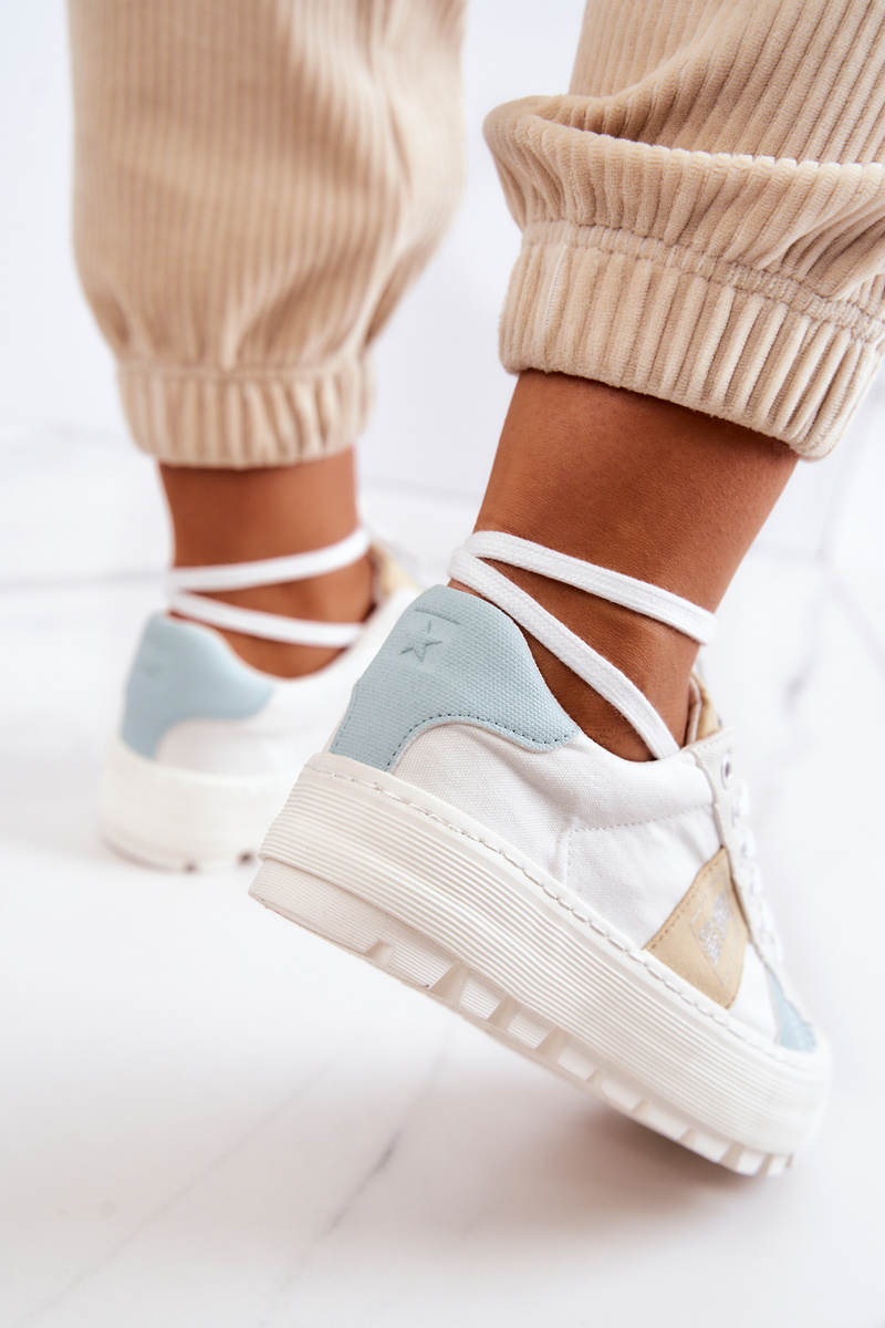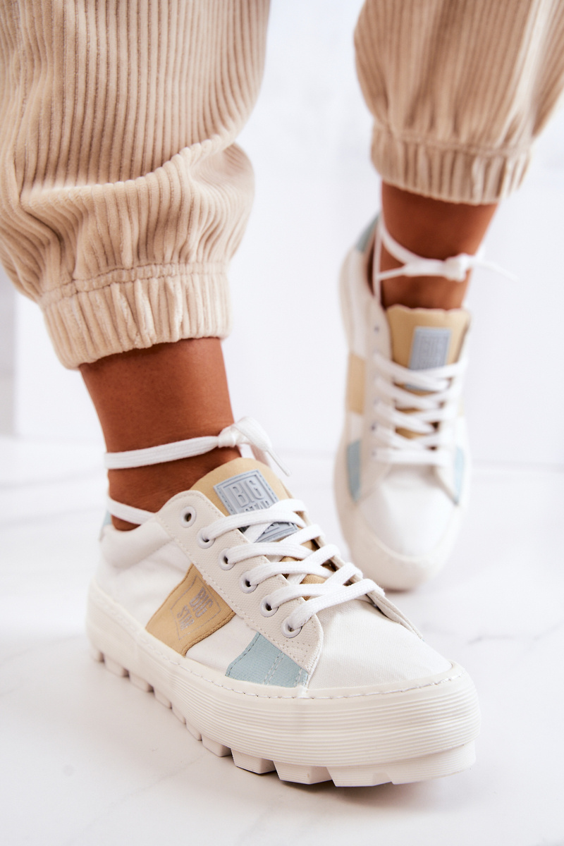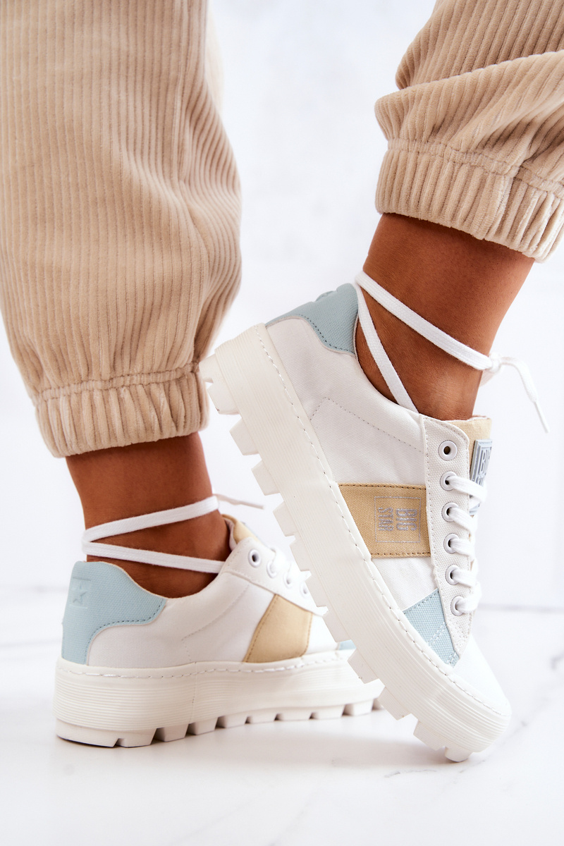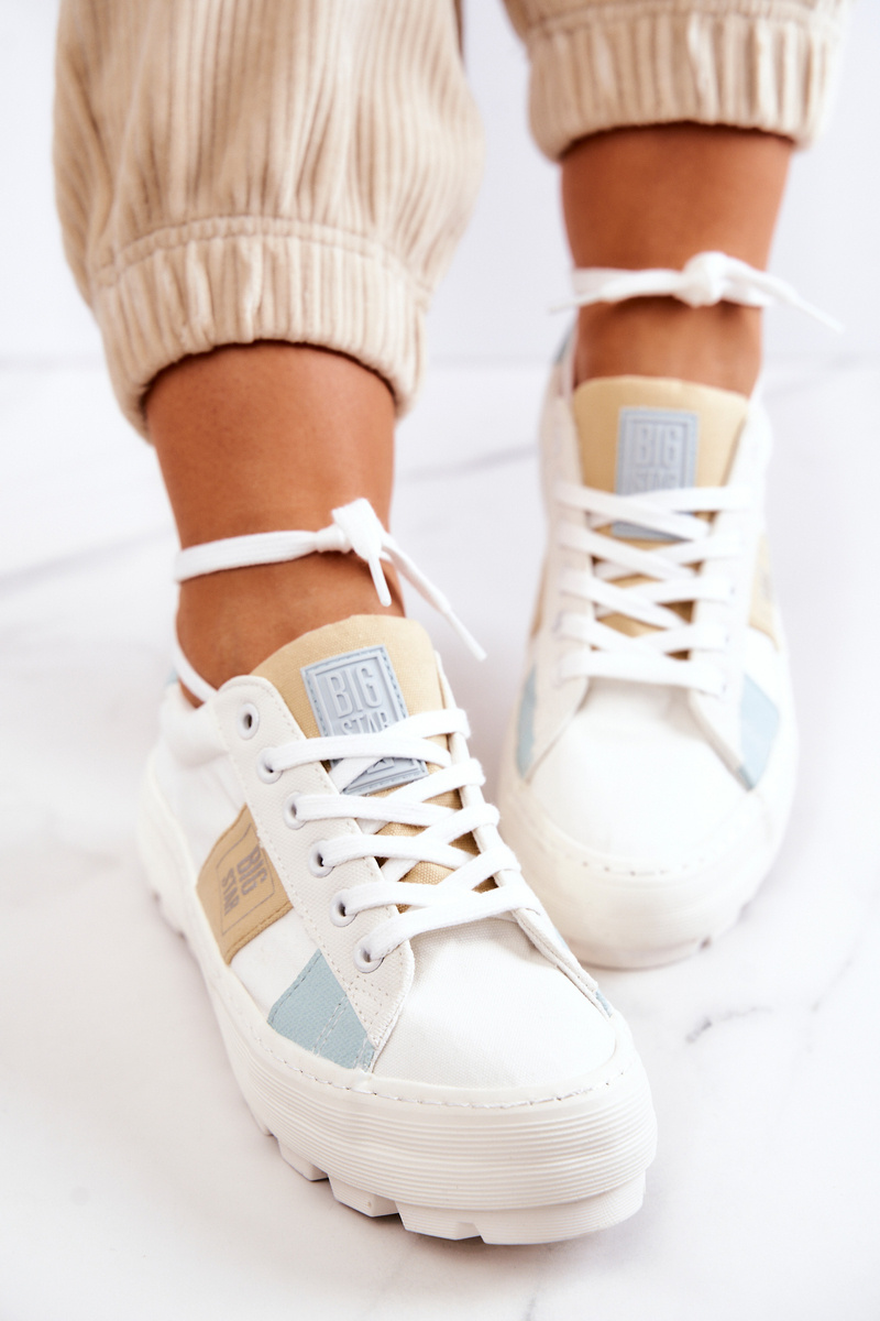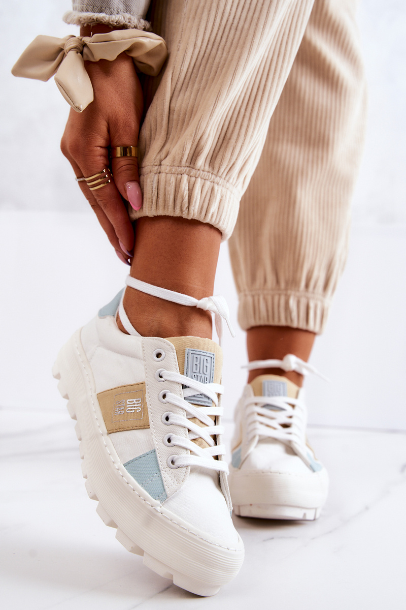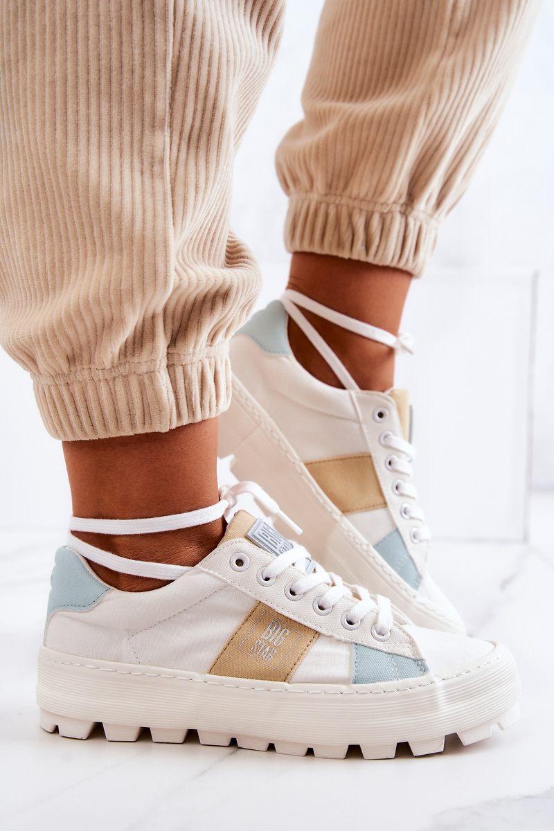 A beautiful model of sneakers from the Big Star brand! Made of fabric, decorative sewn pieces of fabrics of a different color. They have a massive, non-slip platform that will gently lift your figure and at the same time provide stability on uneven ground. Classically tied sneakers. A great model for many styles! When choosing a size, please use the size chart.