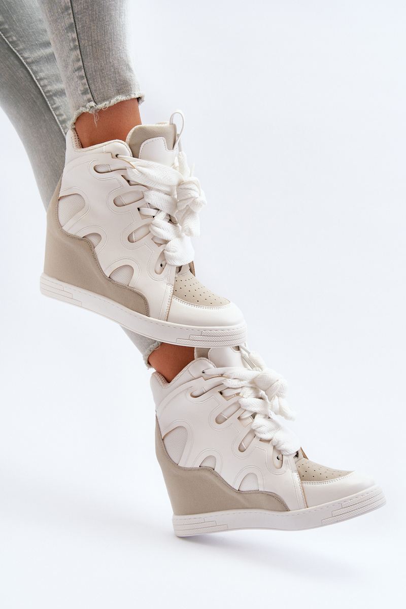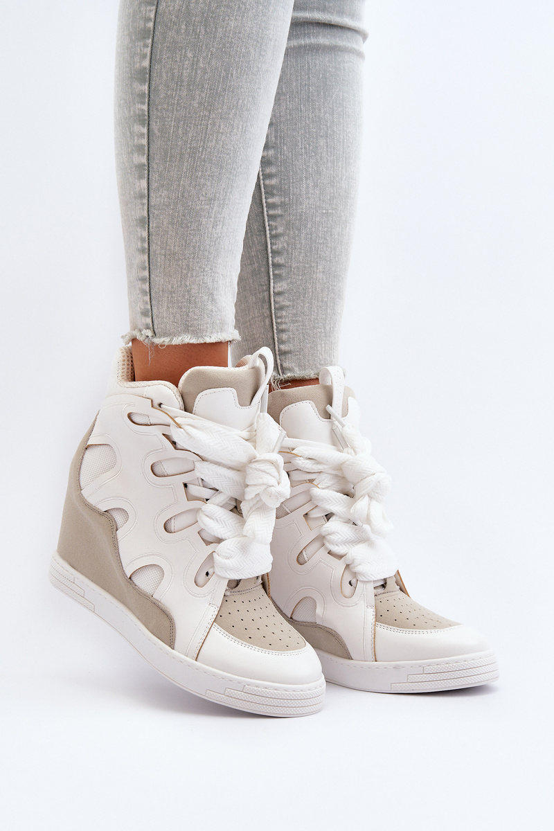Women's sneakers made from a combination of eco leather and textile material. Set on a hidden wedge that will gently lift your silhouette. This model has double lacing. You should definitely have this style in your wardrobe if you value fashionable design! When choosing a size, please refer to the size chart.
