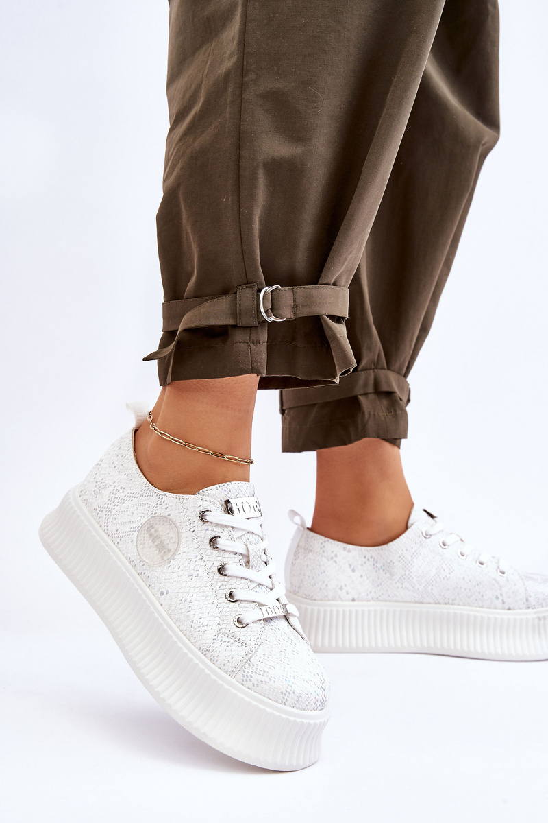 Great women's sneakers made of high-quality eco leather. This fashionable cut will perfectly match with everyday stylizations. The classic lace-up model has a rubber emblem with the GOE brand logo on the side. The soft, eco-leather insole will make you feel comfortable in them all day long. The massive platform has grooves on the sides. When choosing a size, please refer to the size chart.