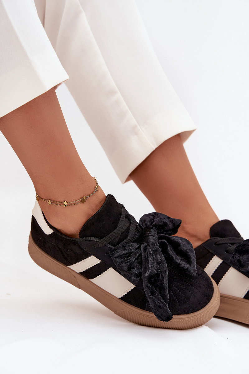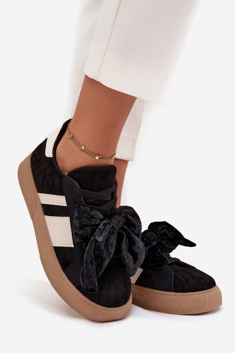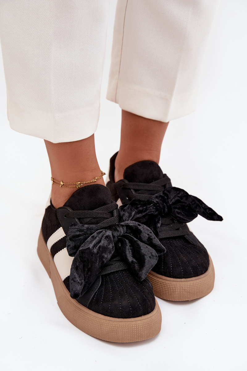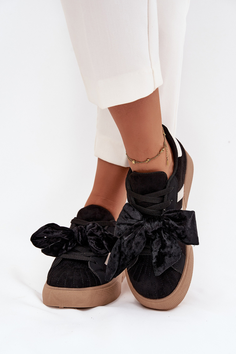 Women's sneakers made from soft eco-suede are comfortable and stylish footwear for everyday wear. Positioned on a platform, they provide comfort, and the wide, rounded toes guarantee freedom for the feet. The main feature that gives them a unique character is the eye-catching velour bow on the lacing, which attracts attention and highlights a fashionable look. This is an ideal model for women who like to combine sporty comfort with feminine details. When choosing a size, please refer to the size chart.