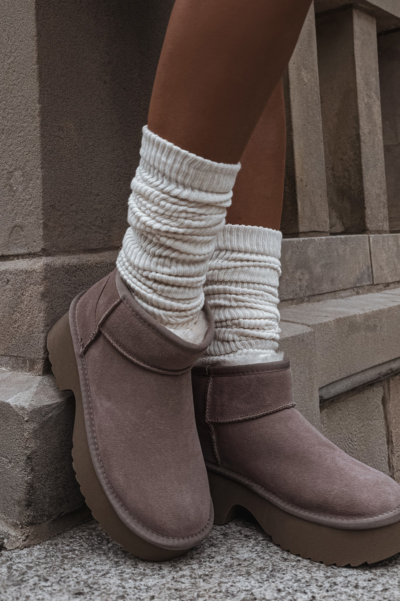 Women's snow boots made of natural suede are a stylish choice for winter days. Placed on a platform, they provide stability and comfort while walking, and effectively insulate from the cold. The interior of the shoes is lined with fur, guaranteeing warmth and comfort on cold days. The fashionable design makes the snow boots perfectly aligned with current trends. An ideal choice for women who value style and comfort in winter outfits. When choosing a size, please refer to the size chart.