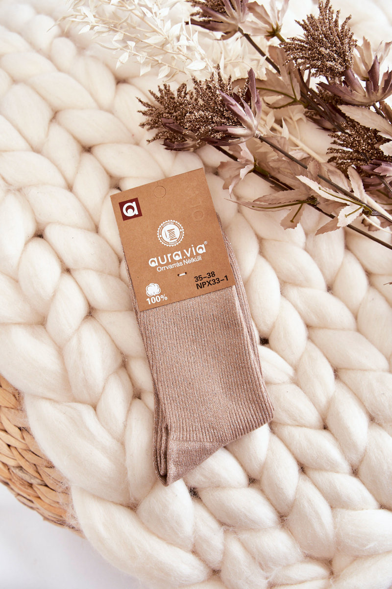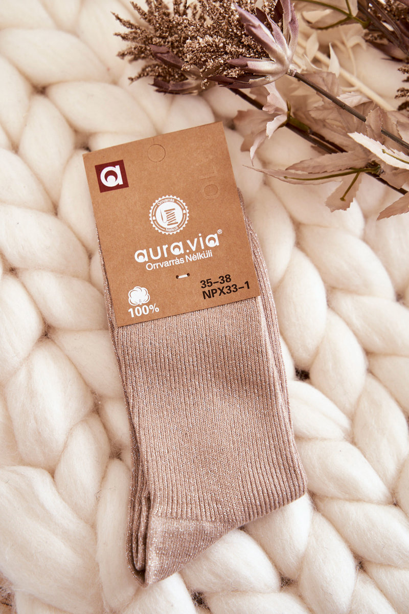 Fashionable women's socks are made of cotton fabric with the addition of lurex, i.e. a metallic thread. These socks are pressure-free. The model is slightly ribbed, above the ankle. These socks are perfect as an addition to everyday styling with loafer shoes. This model should definitely be in your wardrobe!