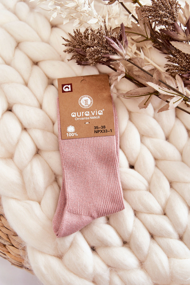 Fashionable women's socks are made of cotton fabric with the addition of lurex, i.e. a metallic thread. These socks are pressure-free. The model is slightly ribbed, above the ankle. These socks are perfect as an addition to everyday styling with loafer shoes. This model should definitely be in your wardrobe!