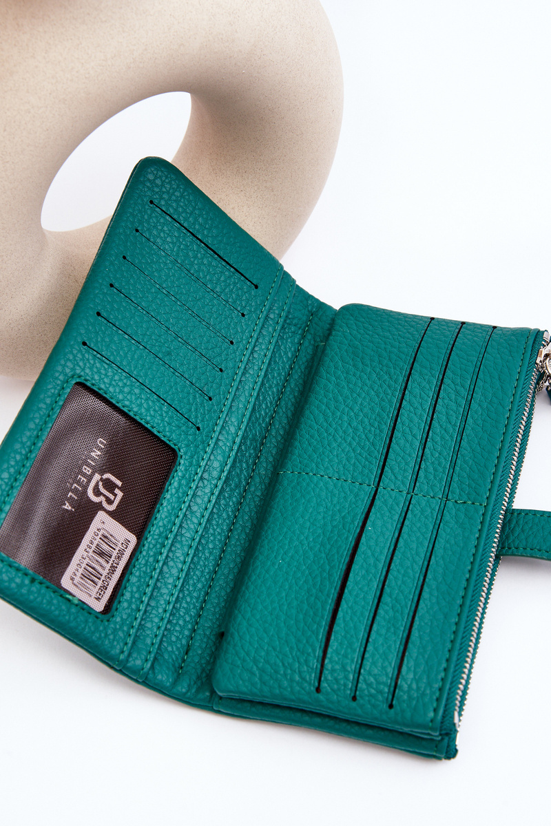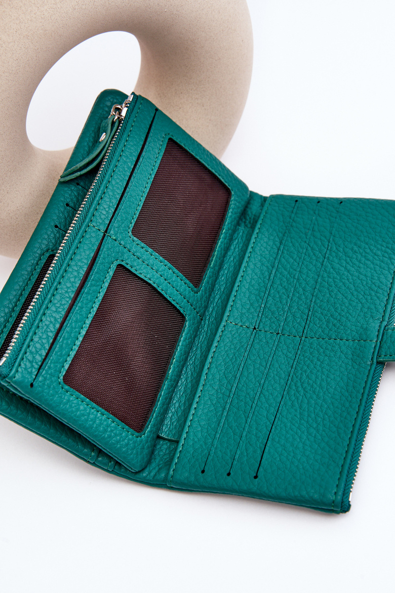 Large women's wallet made of eco leather. Fastened with a clasp and zipper. Inside there are open compartments and one closed with a zipper. Additionally, the wallet also contains many places for business cards or credit cards. This wallet will certainly hold the most essential things!