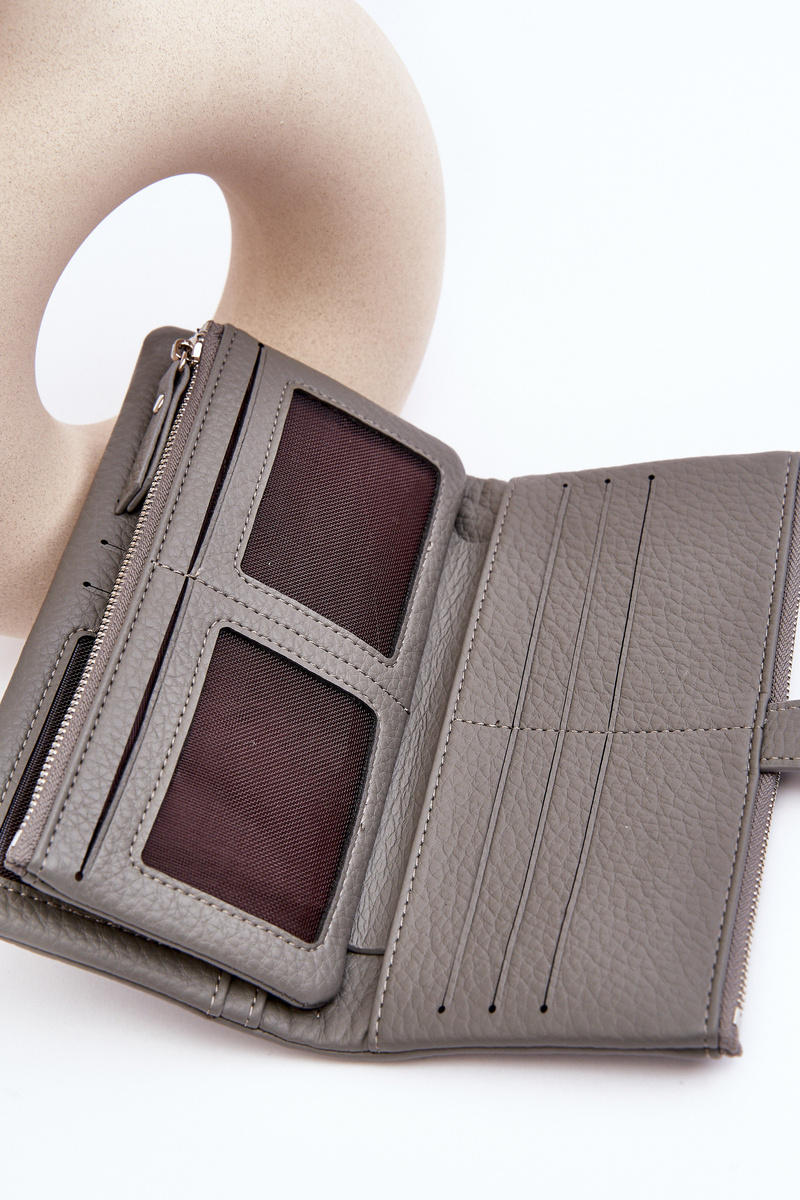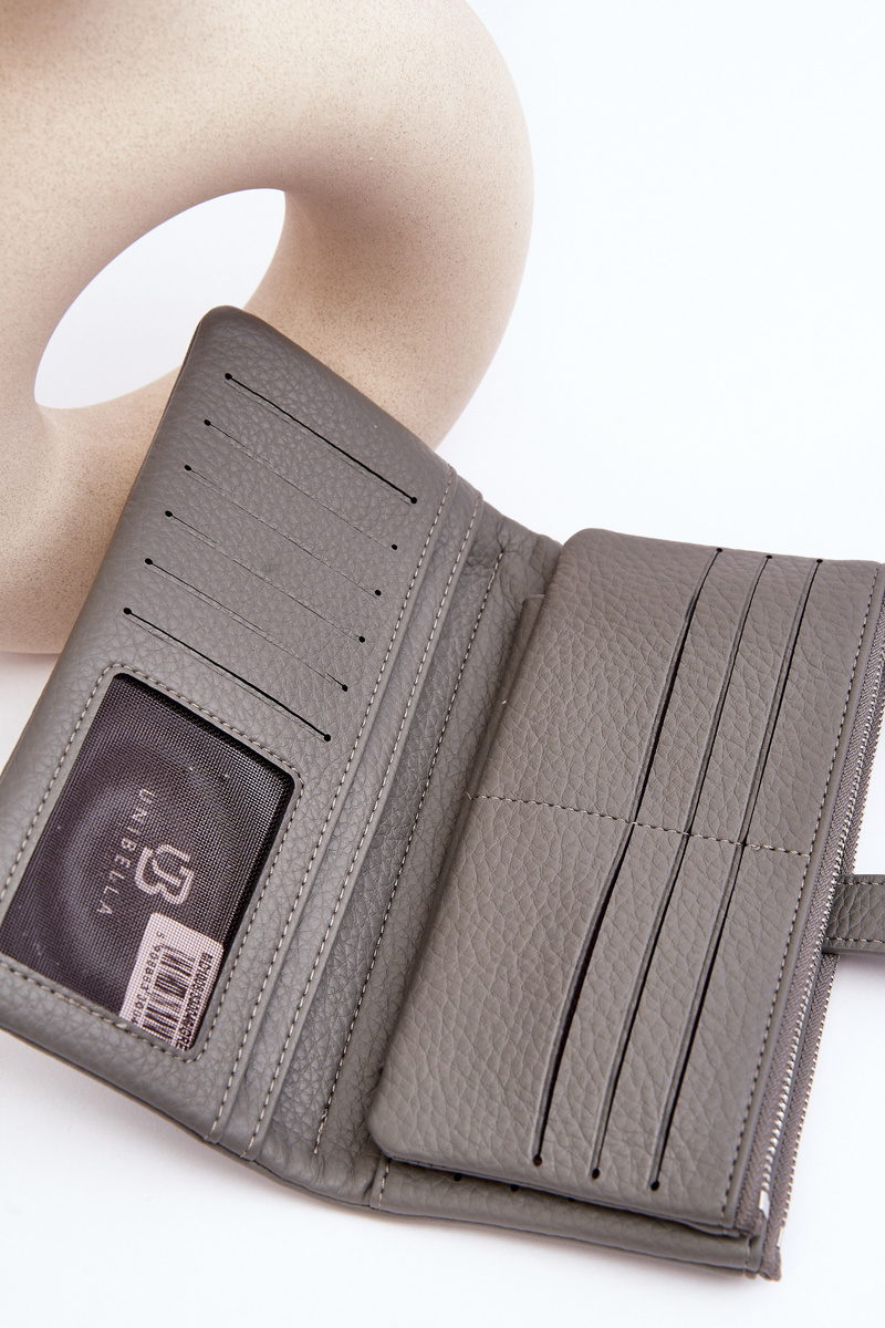 Large women's wallet made of eco leather. Fastened with a clasp and zipper. Inside there are open compartments and one closed with a zipper. Additionally, the wallet also contains many places for business cards or credit cards. This wallet will certainly hold the most essential things!
