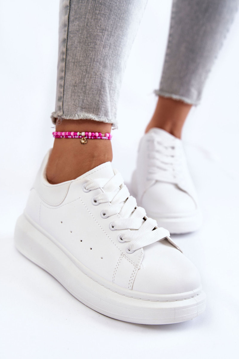 Comfortable sports shoes for women are made of high-quality eco leather with a delicate perforation on the side of the upper. Tied with flat laces. They are mounted on a massive platform made of rubber material. The insole is made of eco leather. Rounded nose. A model that suits many sports styles. Be sure to check out the other models of sports footwear available in our offer! When choosing a size, please use the size chart.
